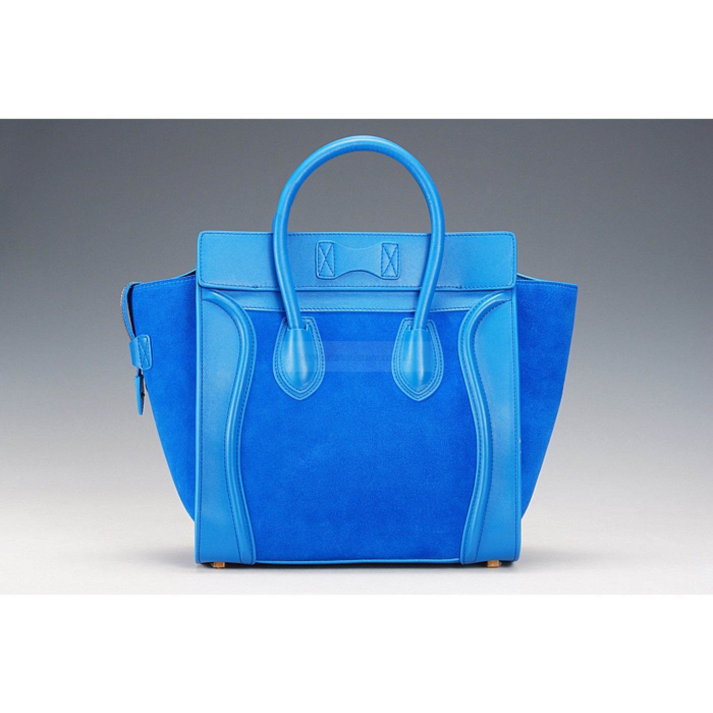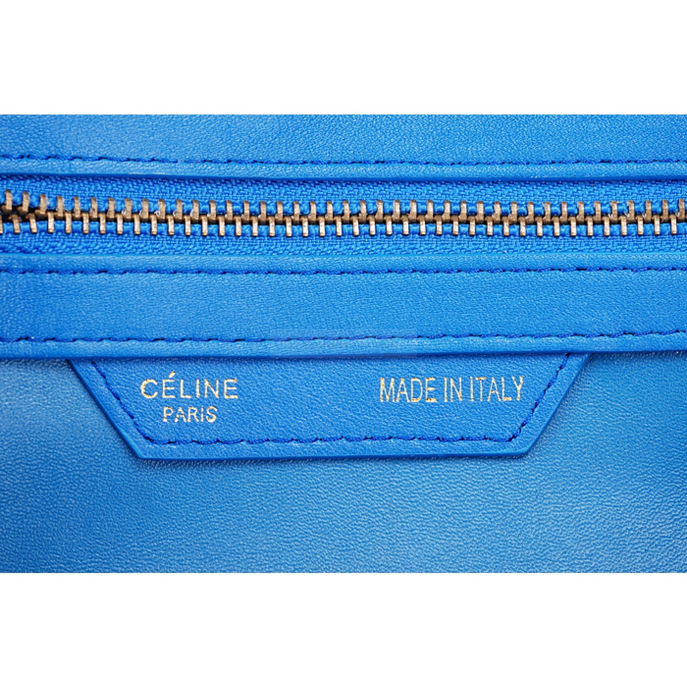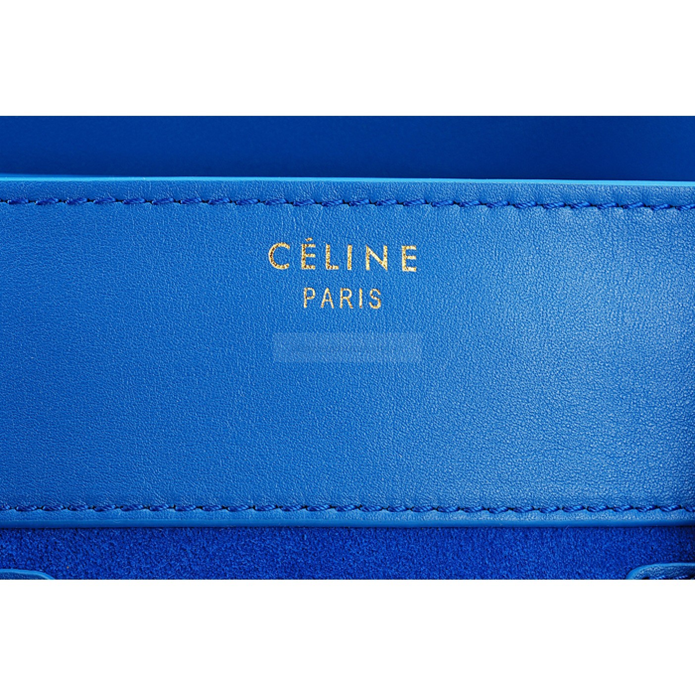 Exterior Blue calfskin leather exterior with black suede center at the front and back, curved leather beading at the front and back, a small flat zipper pocket in the front, Celine Paris heat embossed at the top center front and two ultra-slim rounded leather handles
