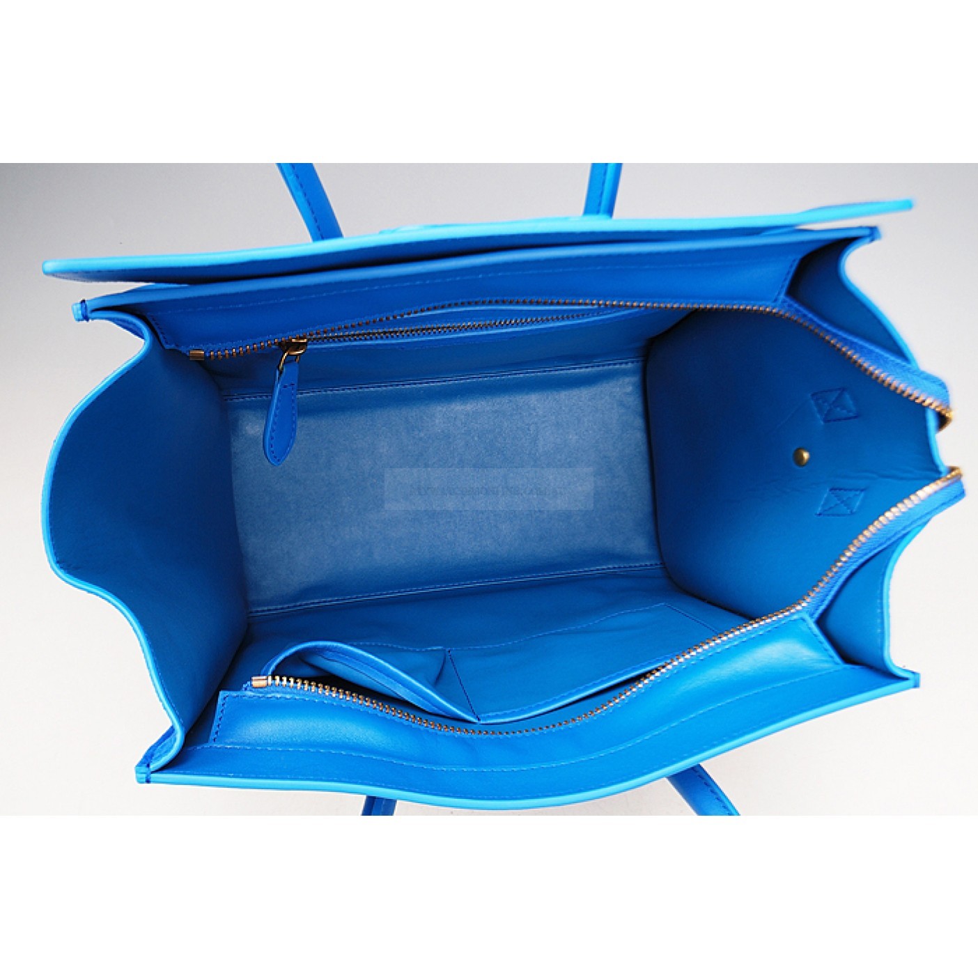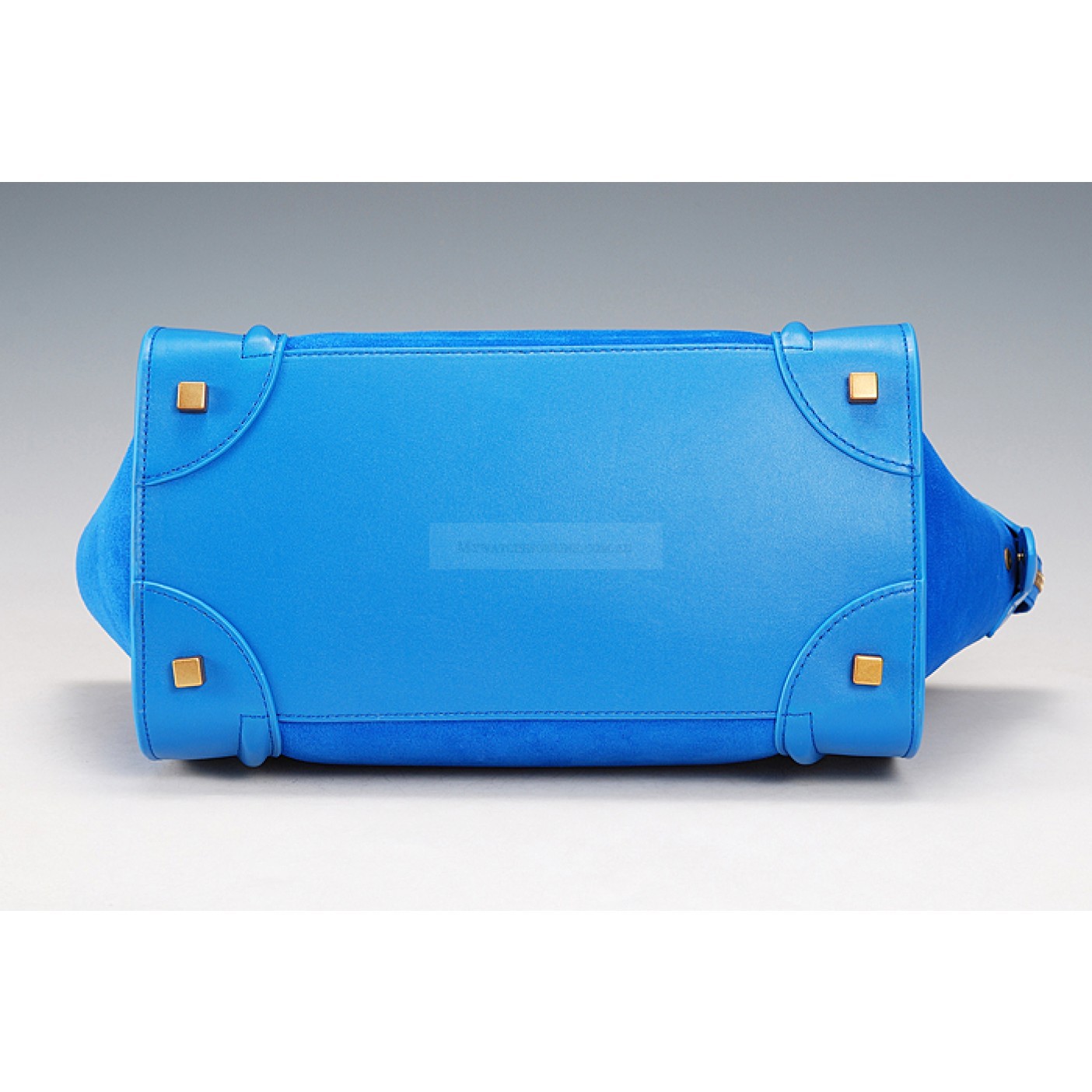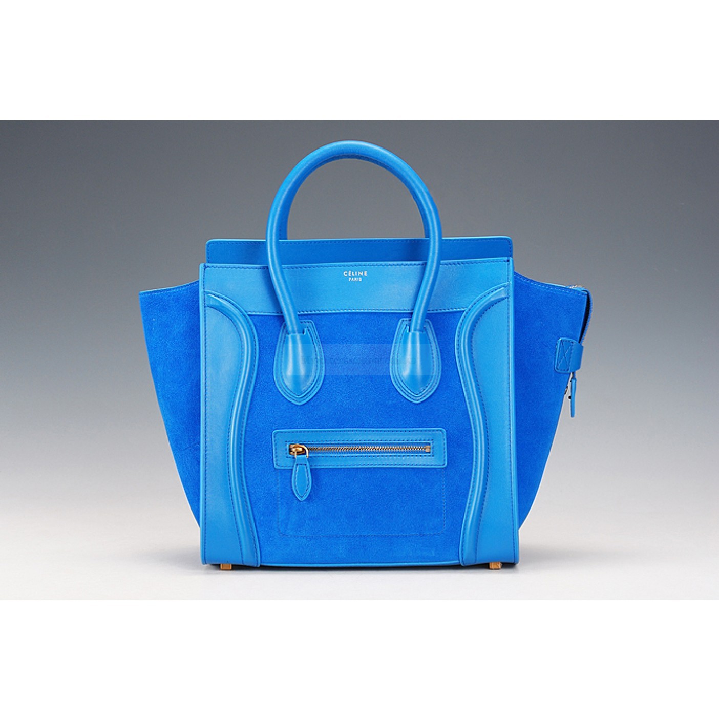 Exterior Blue calfskin leather exterior with black suede center at the front and back, curved leather beading at the front and back, a small flat zipper pocket in the front, Celine Paris heat embossed at the top center front and two ultra-slim rounded leather handles