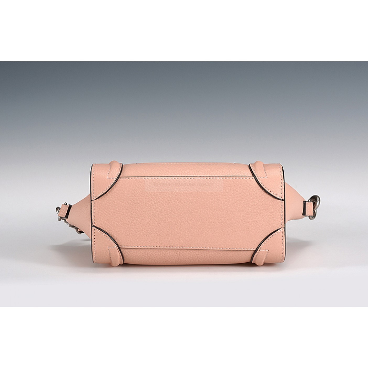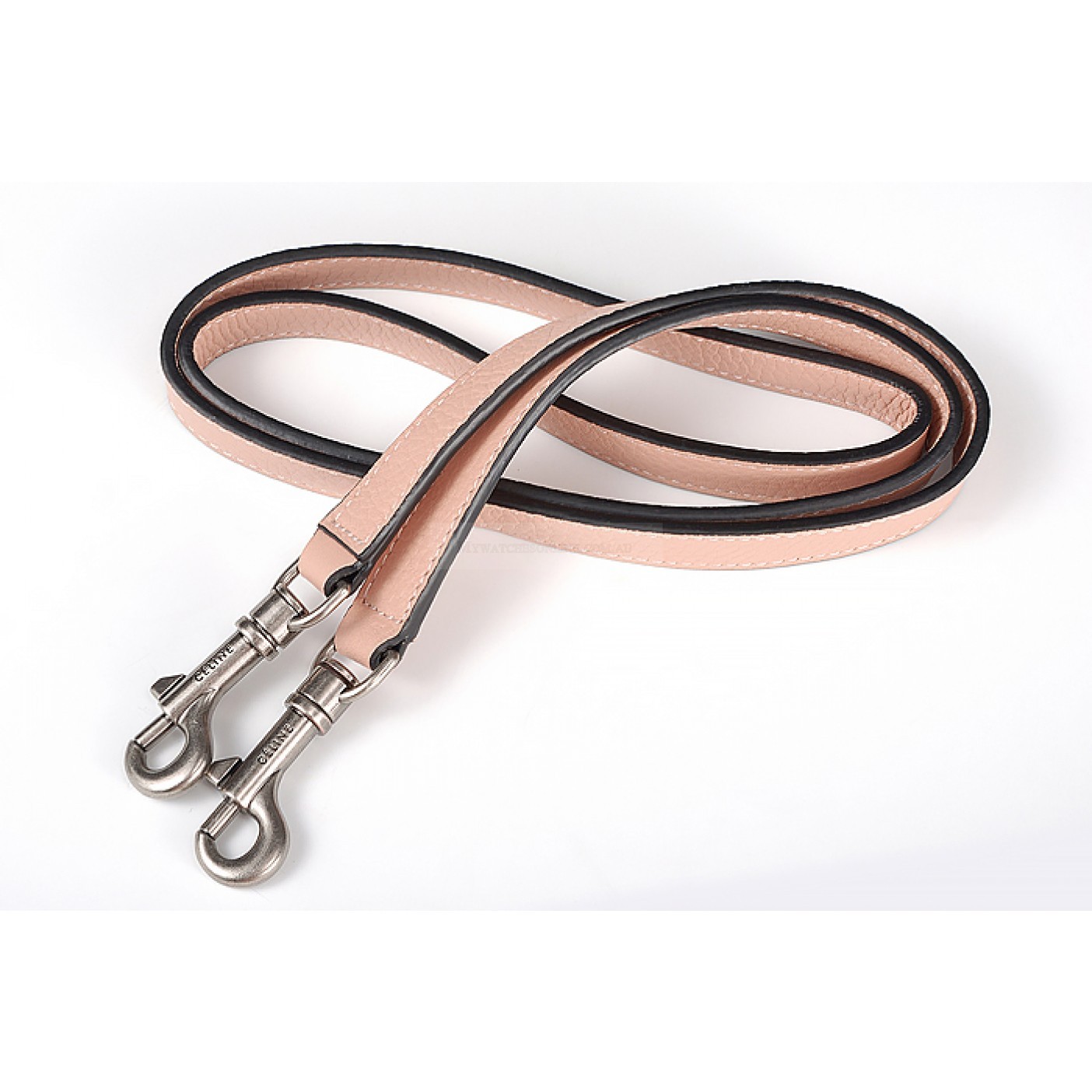 Exterior Pink cowhide leather exterior with flat wide base, curved beading at the front and back, a small flat zipper pocket at the center front, Celine Paris heat embossed at the top front center, two ultra-slim rounded leather handles and a detachable leather shoulder strap