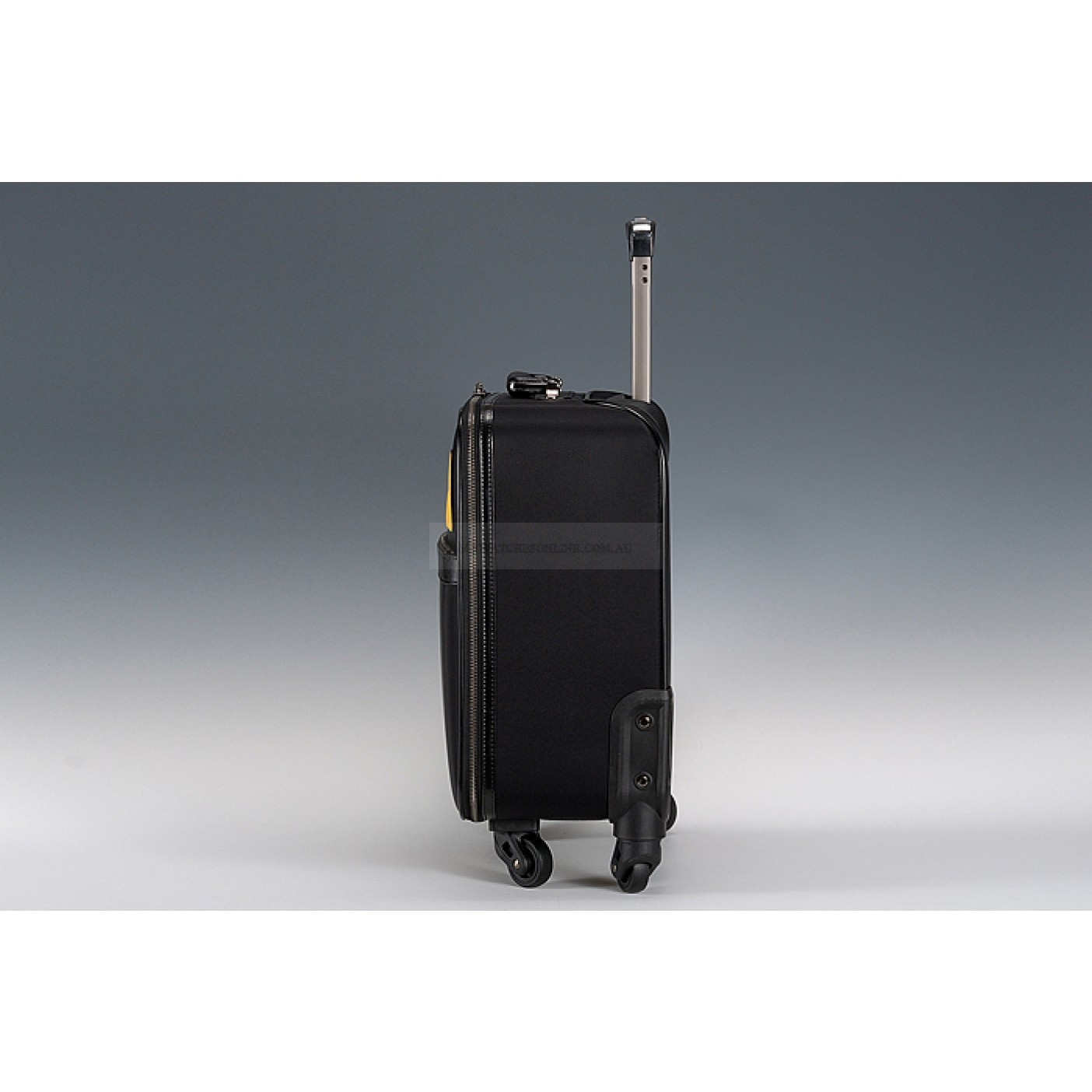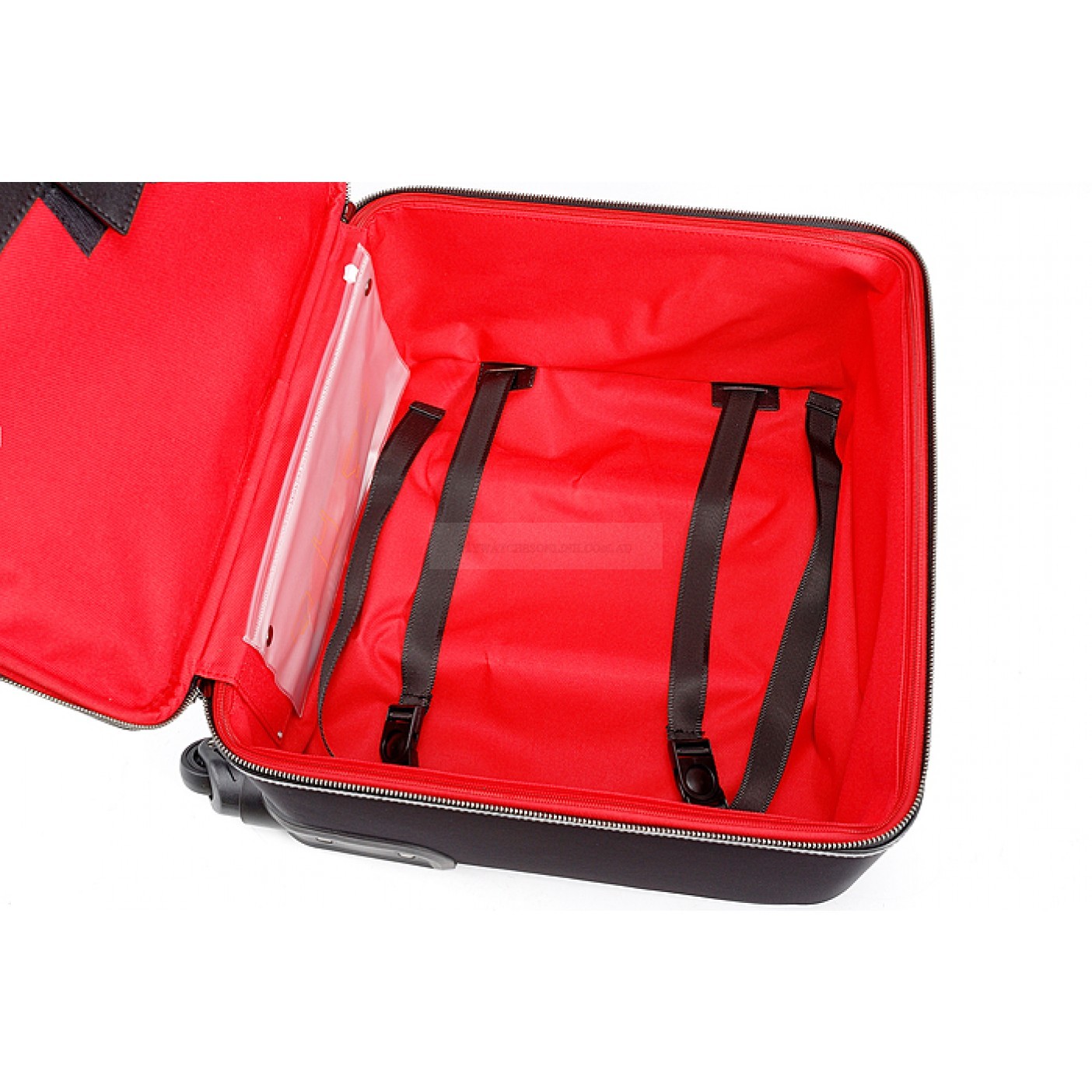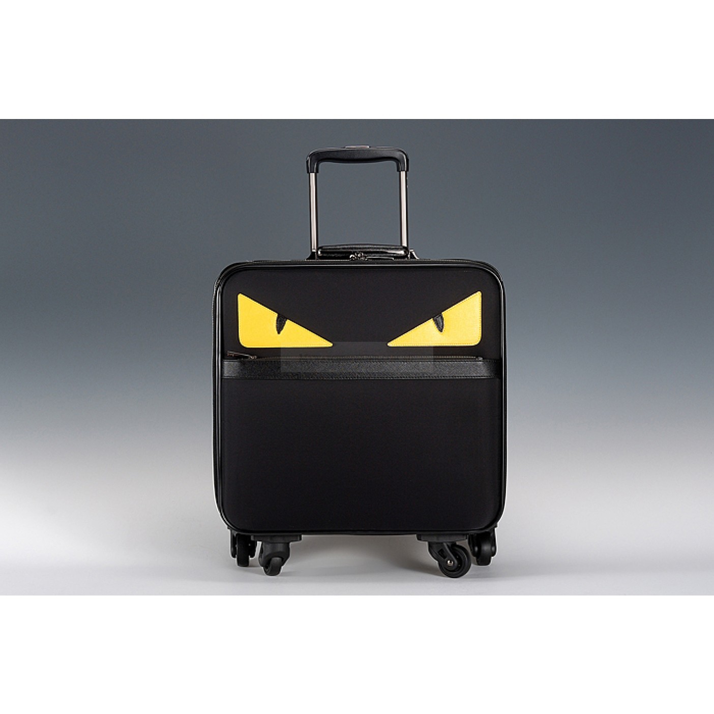 Exterior Black leather exterior with a flat zipper pocket at the front, Fendi Monster eye motif above the zipper pocket in front, a leather trimmed steel top handle and a collapsible steel wheely handle