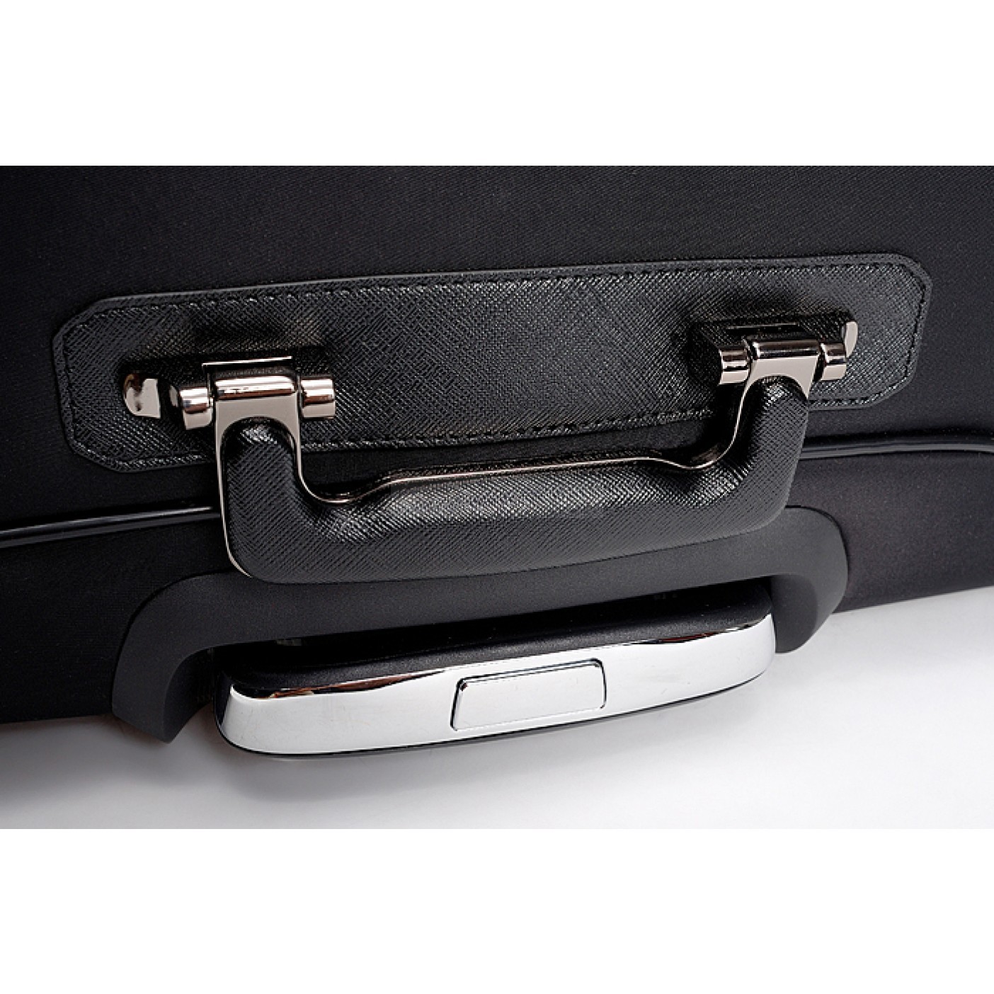 Strap A leather trimmed top steel handle and a collapsible steel wheely handle