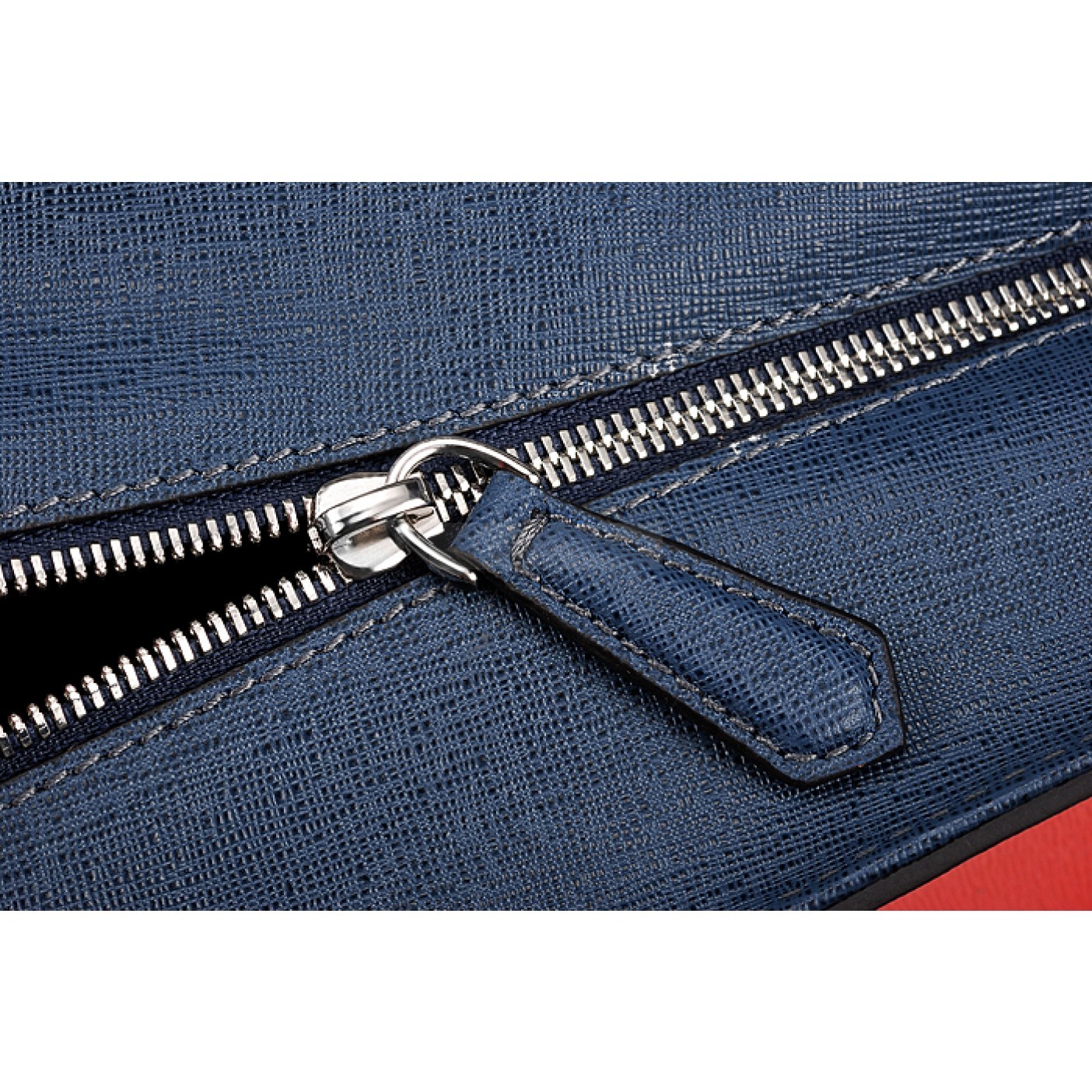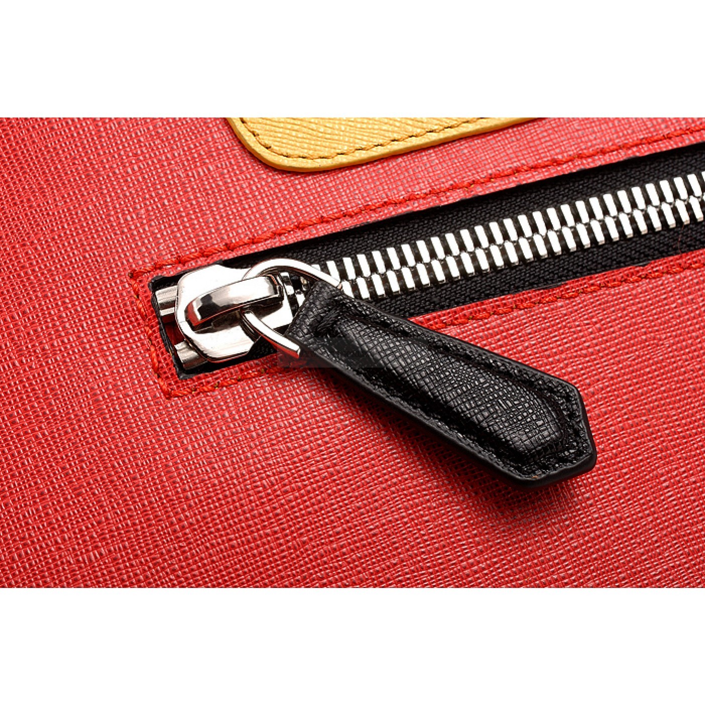 Exterior Orange leather exterior with a small flat zipper pocket in front, a pair of yellow monster eyes and two ultra-thin short black leather shoulder straps