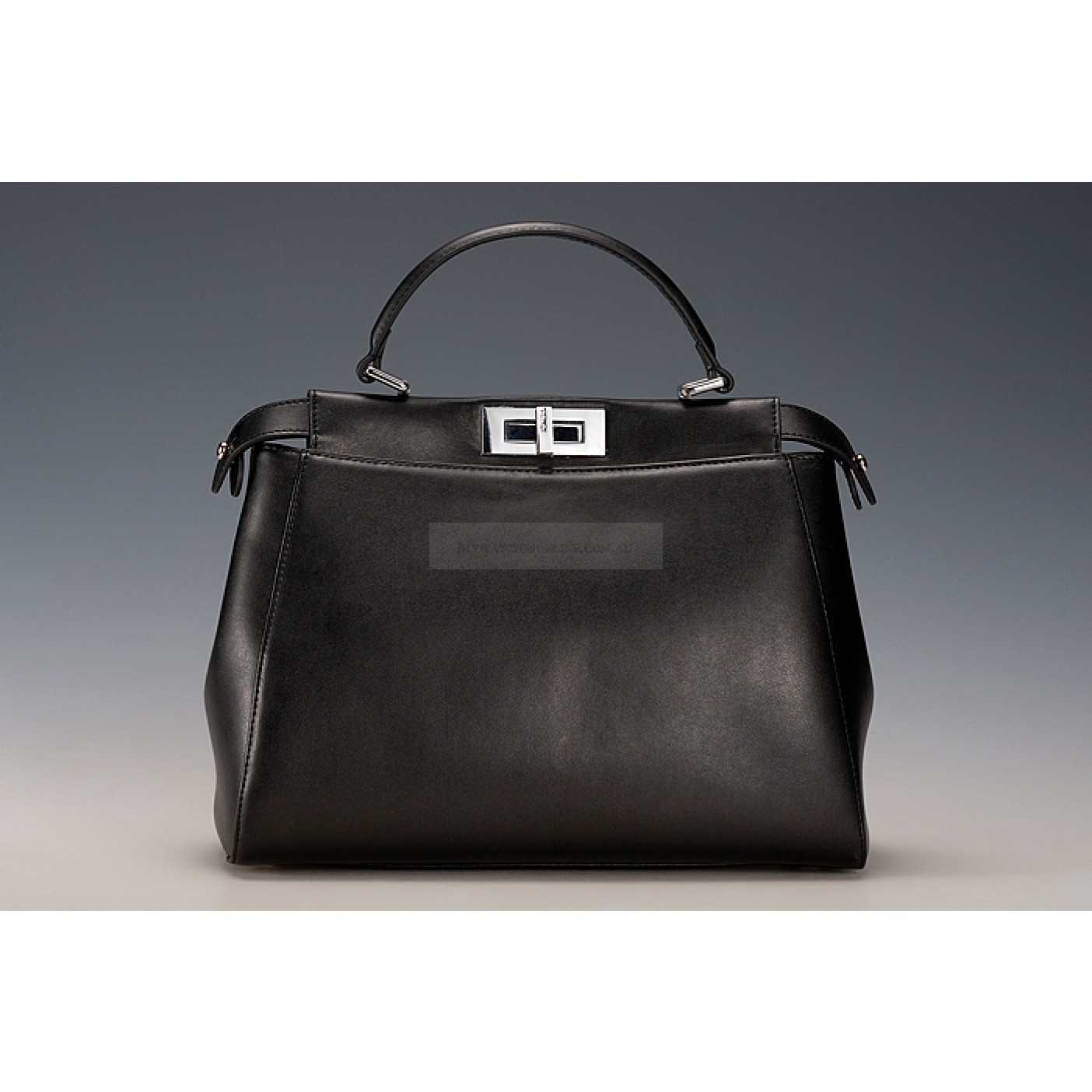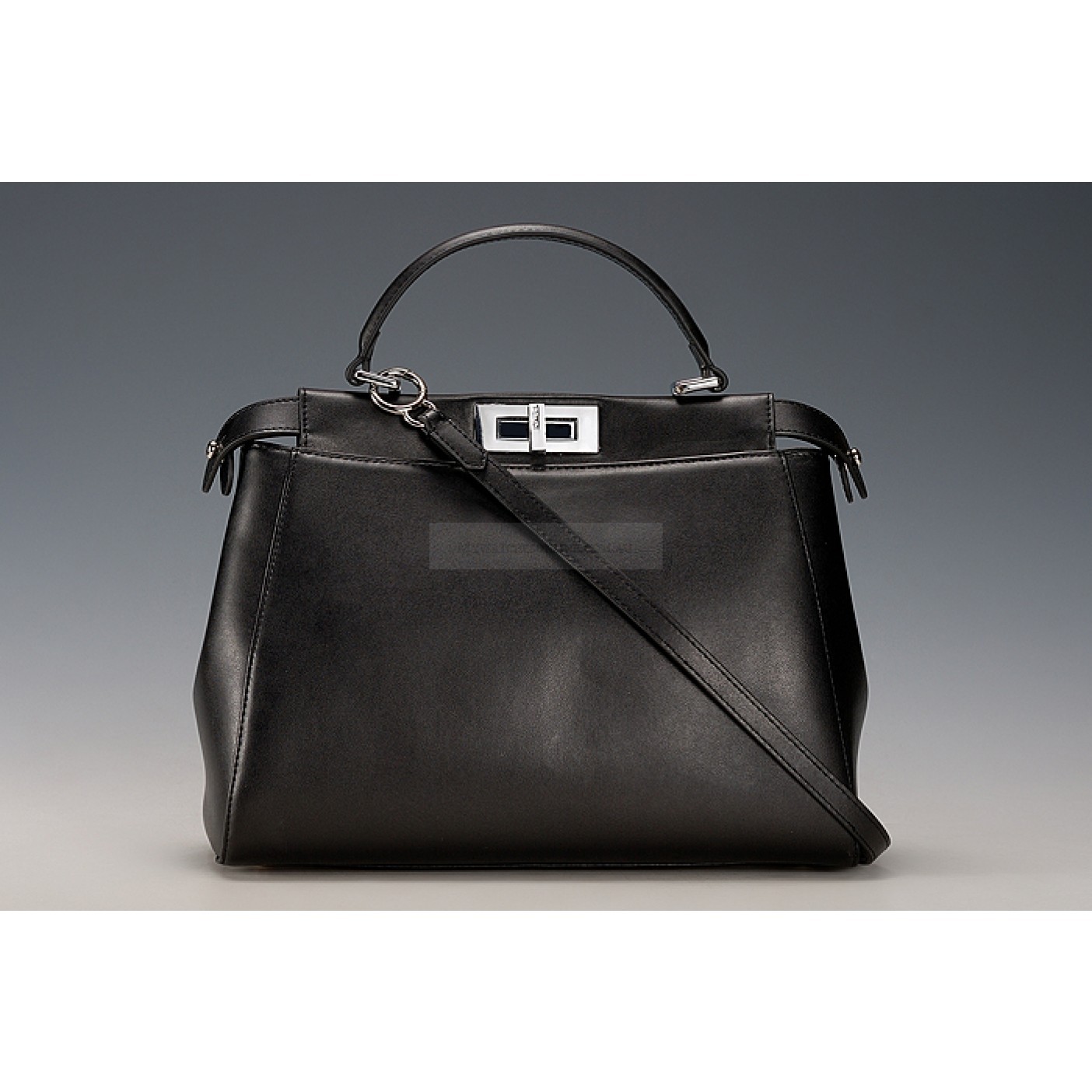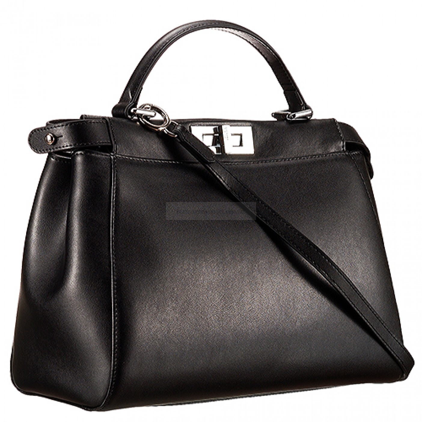 Exterior Black calfskin leather exterior with wide base and slim narrow top, an extended center with side strsps and polished brass Fendi turnlock in the center front and back, a padded leather top handle and a hook-buckle adjustable and detachable ultra thin leather shoulder strap