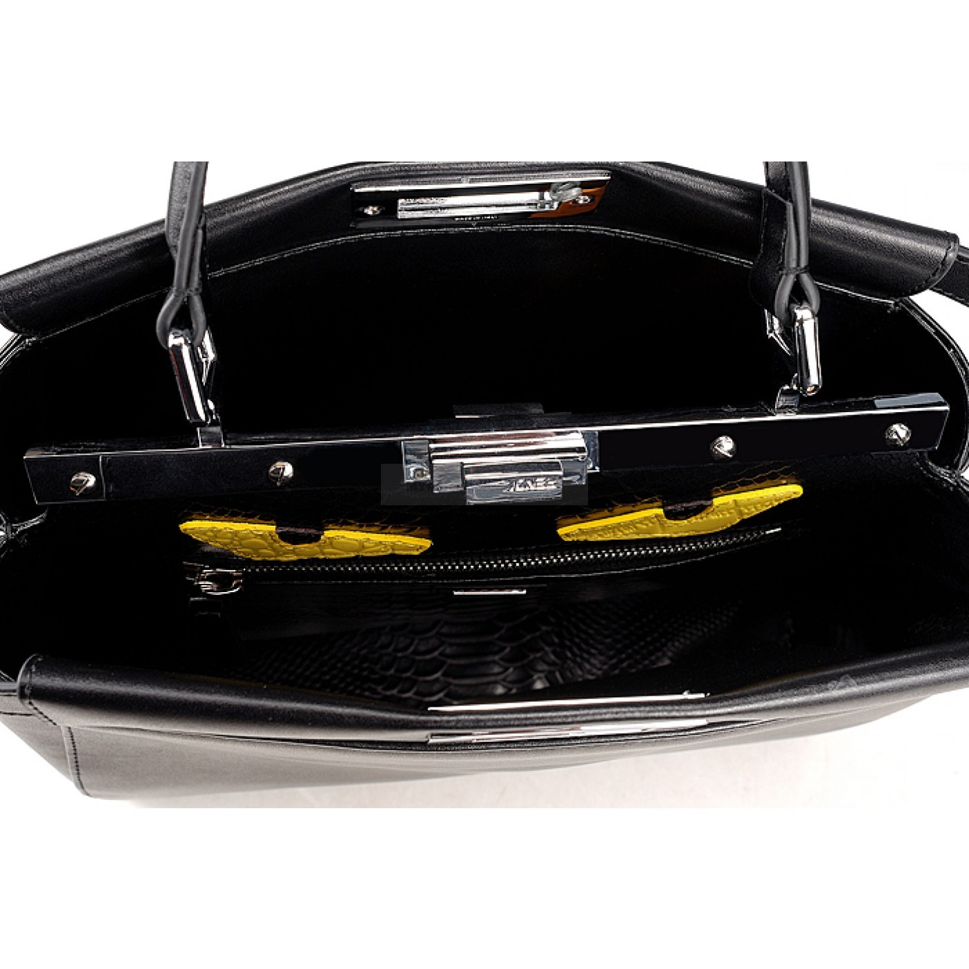 Interior A one side textured and one side plain leather lining with cat-eye leather trim and Made in Italy Fendi engraved polished brass tab leather trim