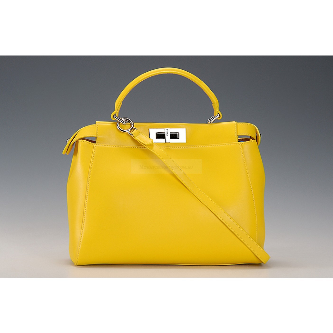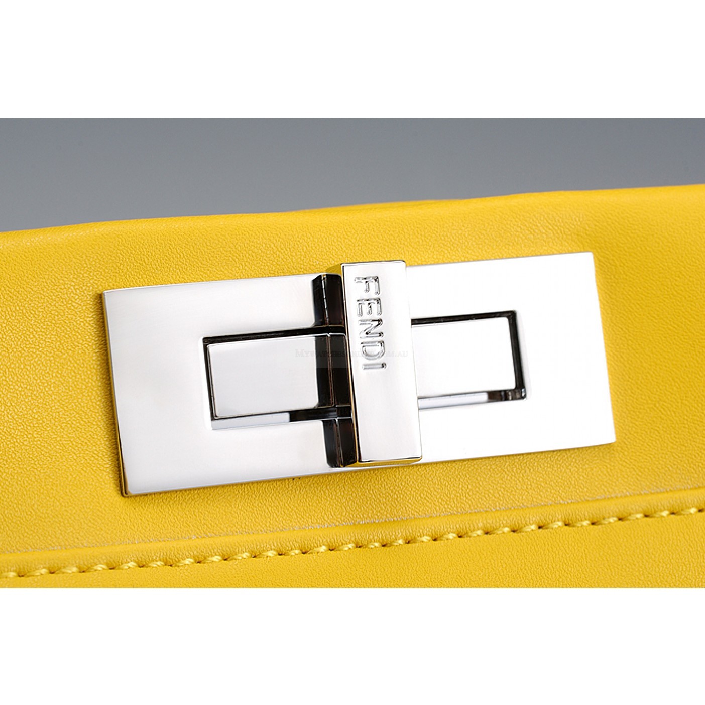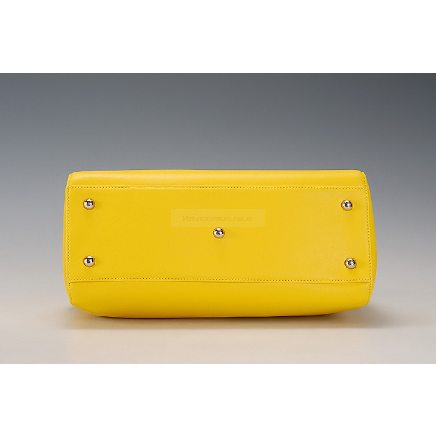 Exterior Yellow calfskin leather exterior with wide base and slim narrow top, an extended center with side strsps and polished brass Fendi turnlock in the center front and back, a padded leather top handle and a hook-buckle adjustable and detachable ultra thin leather shoulder strap