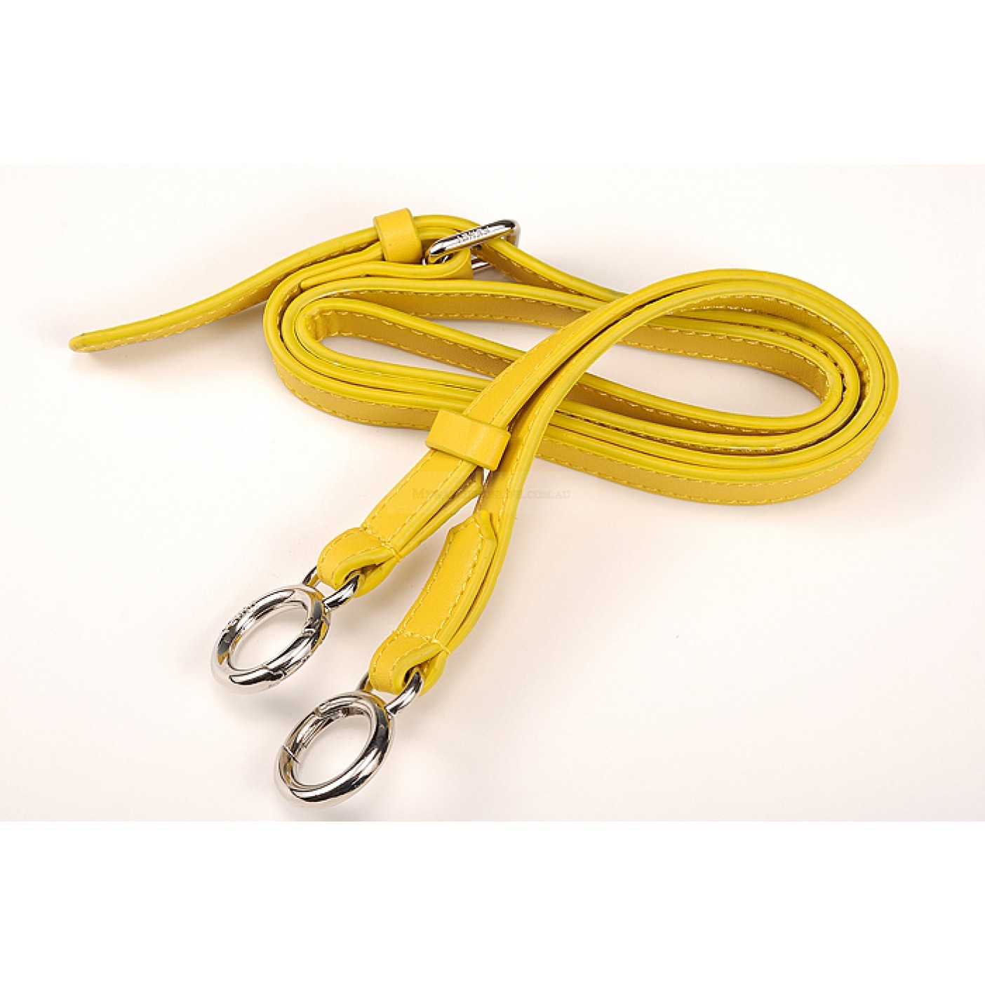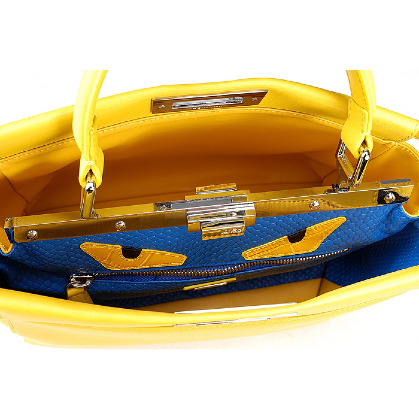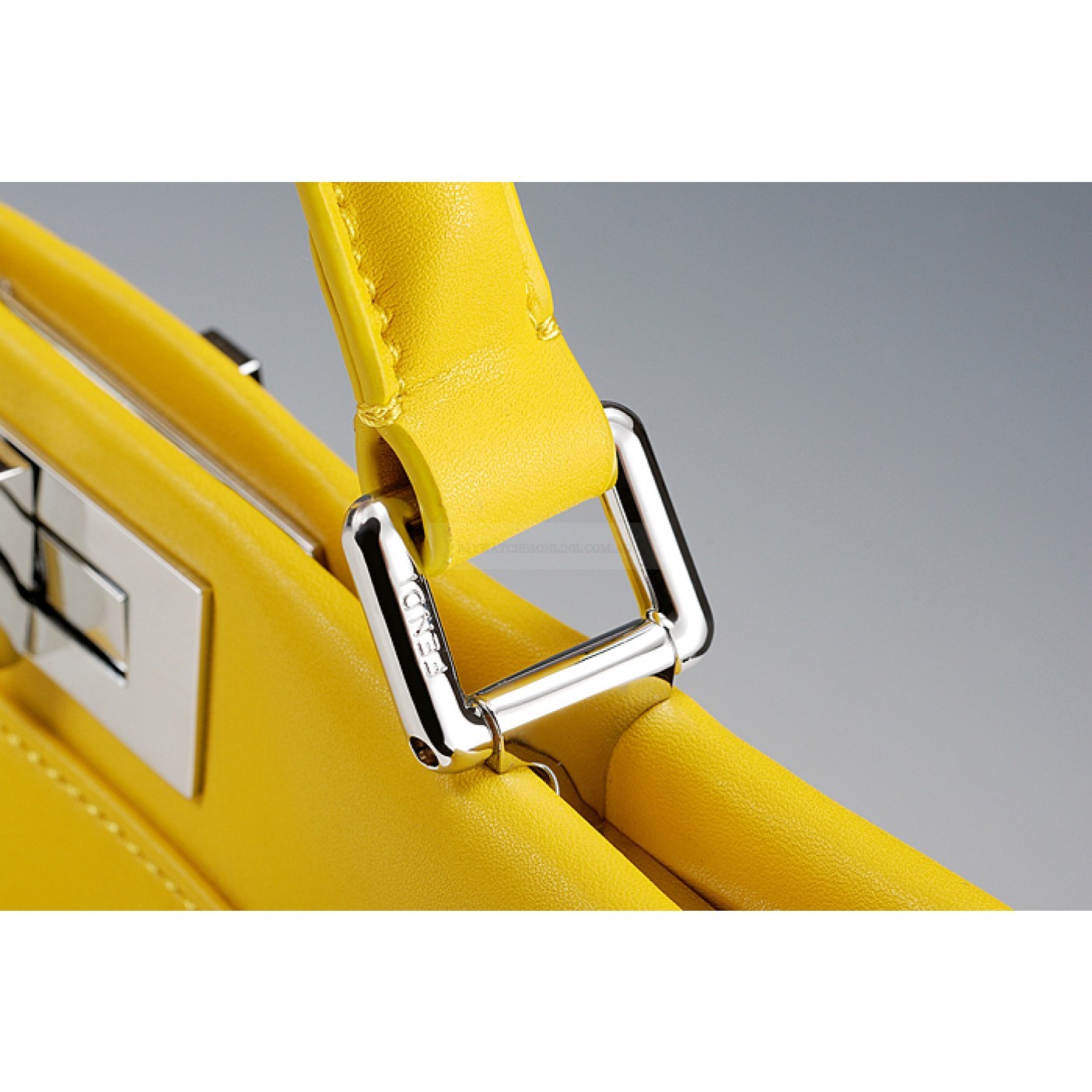 Exterior Yellow calfskin leather exterior with wide base and slim narrow top, an extended center with side strsps and polished brass Fendi turnlock in the center front and back, a padded leather top handle and a hook-buckle adjustable and detachable ultra thin leather shoulder strap