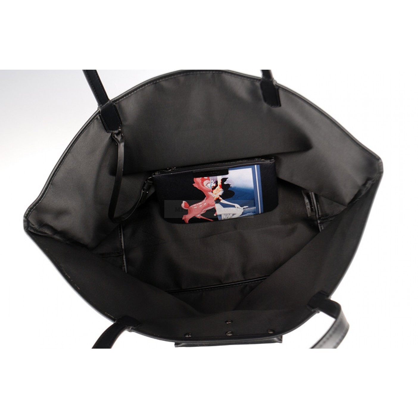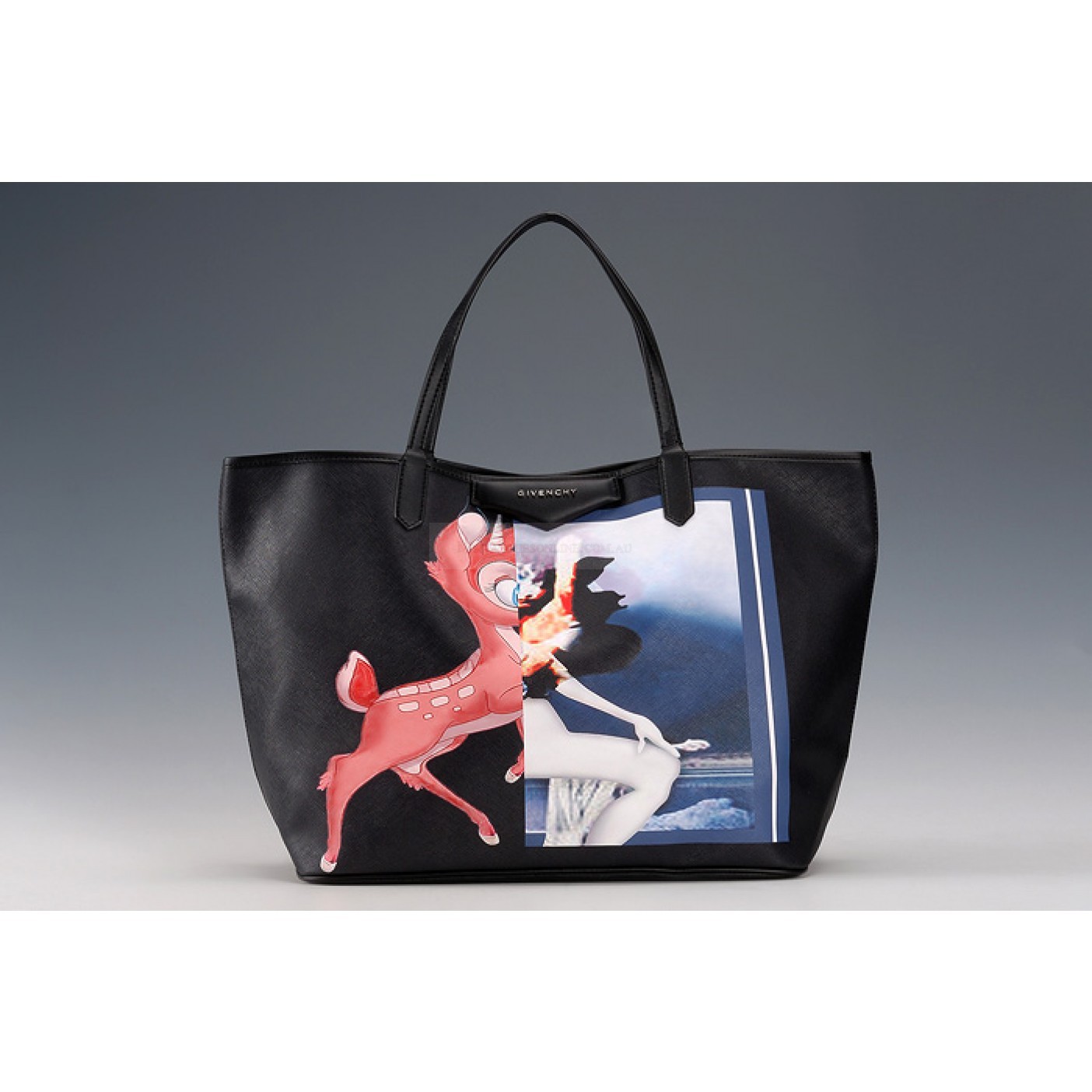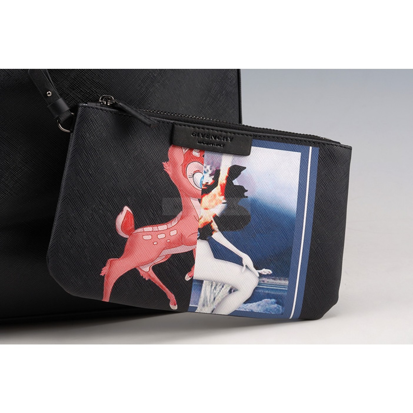 Exterior Black leather exterior with Bambi graphic in front, oxidized metal Givenchy initials leather tab in the top center front and two flat leather arm-carry straps