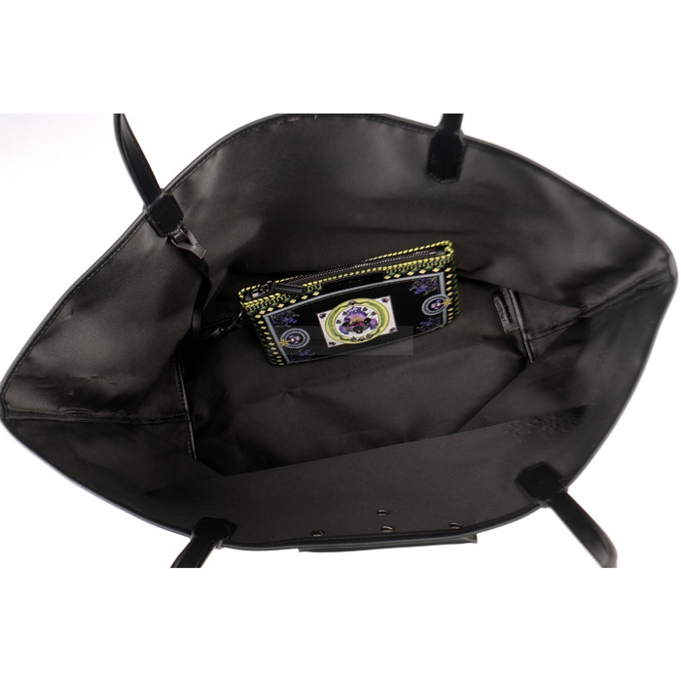 Exterior Black leather floral orchid print exterior, oxidized metal Givenchy initials leather tab in the top center front and two flat leather arm-carry straps