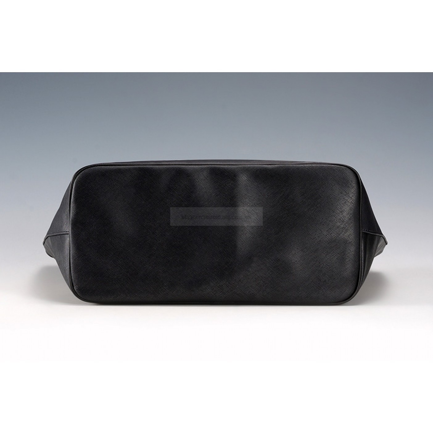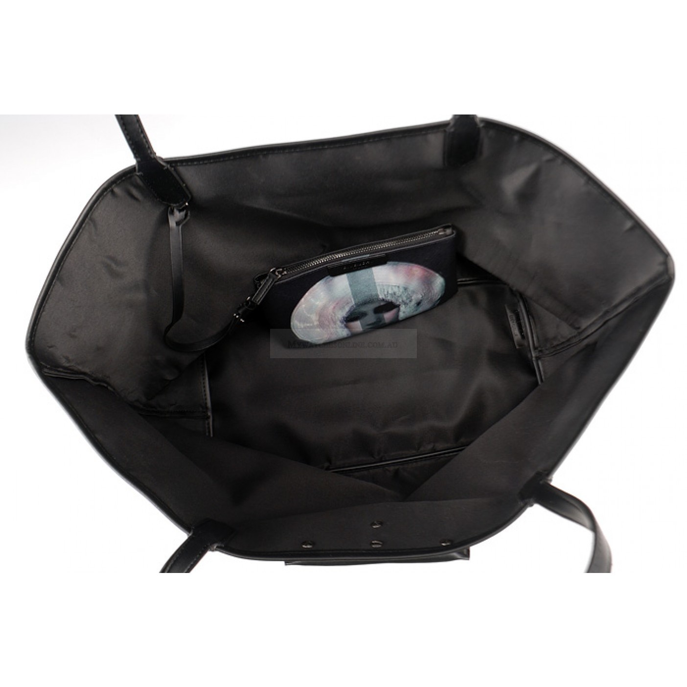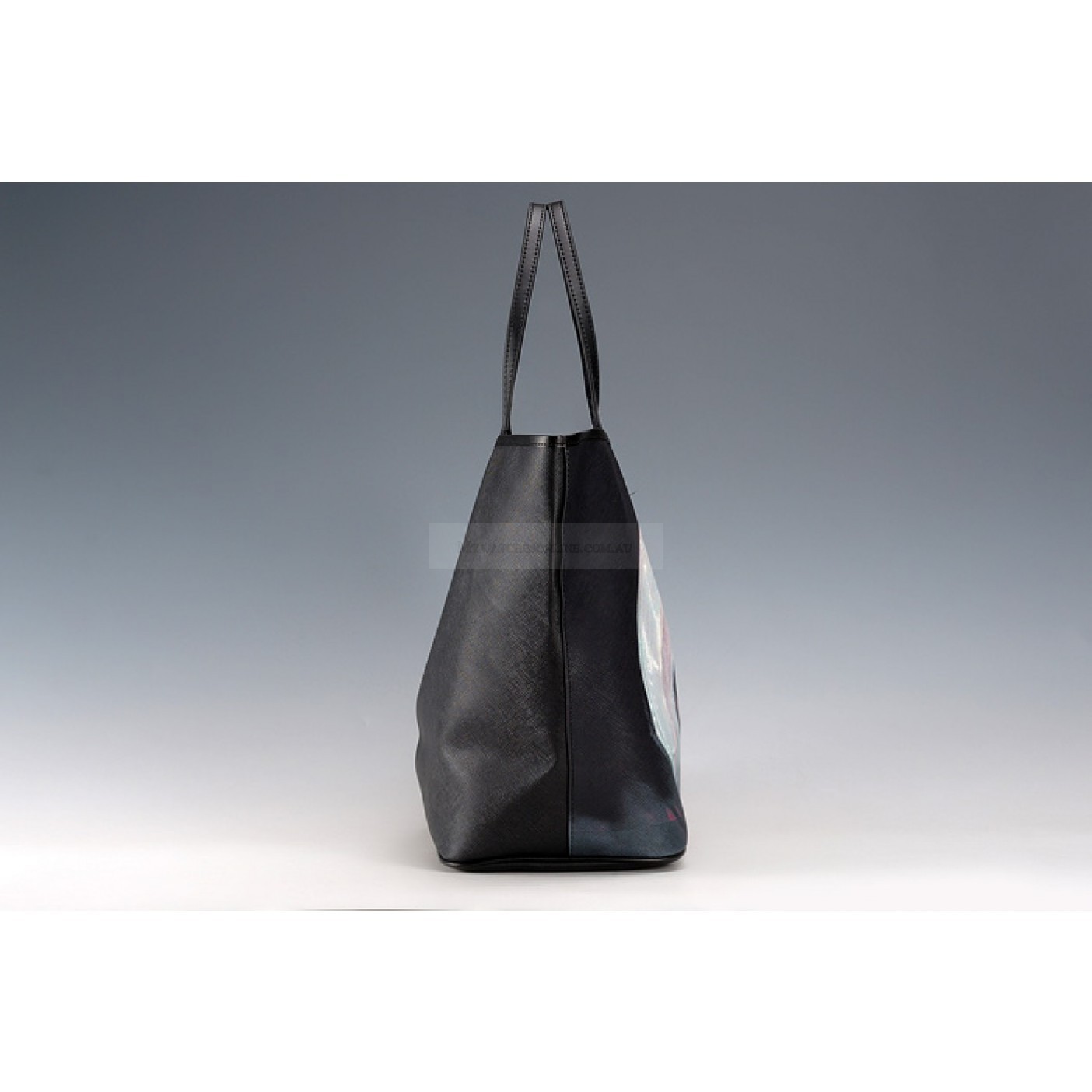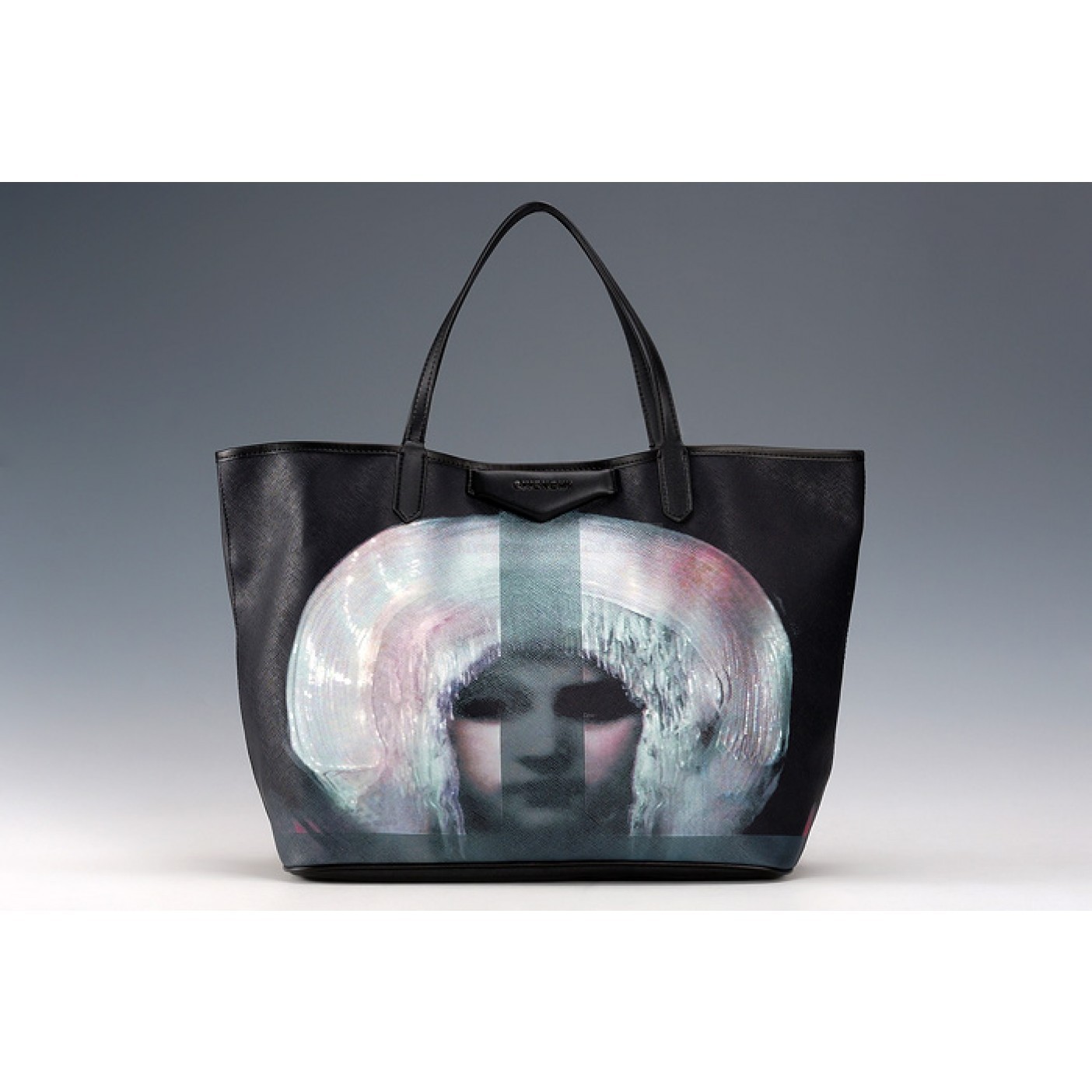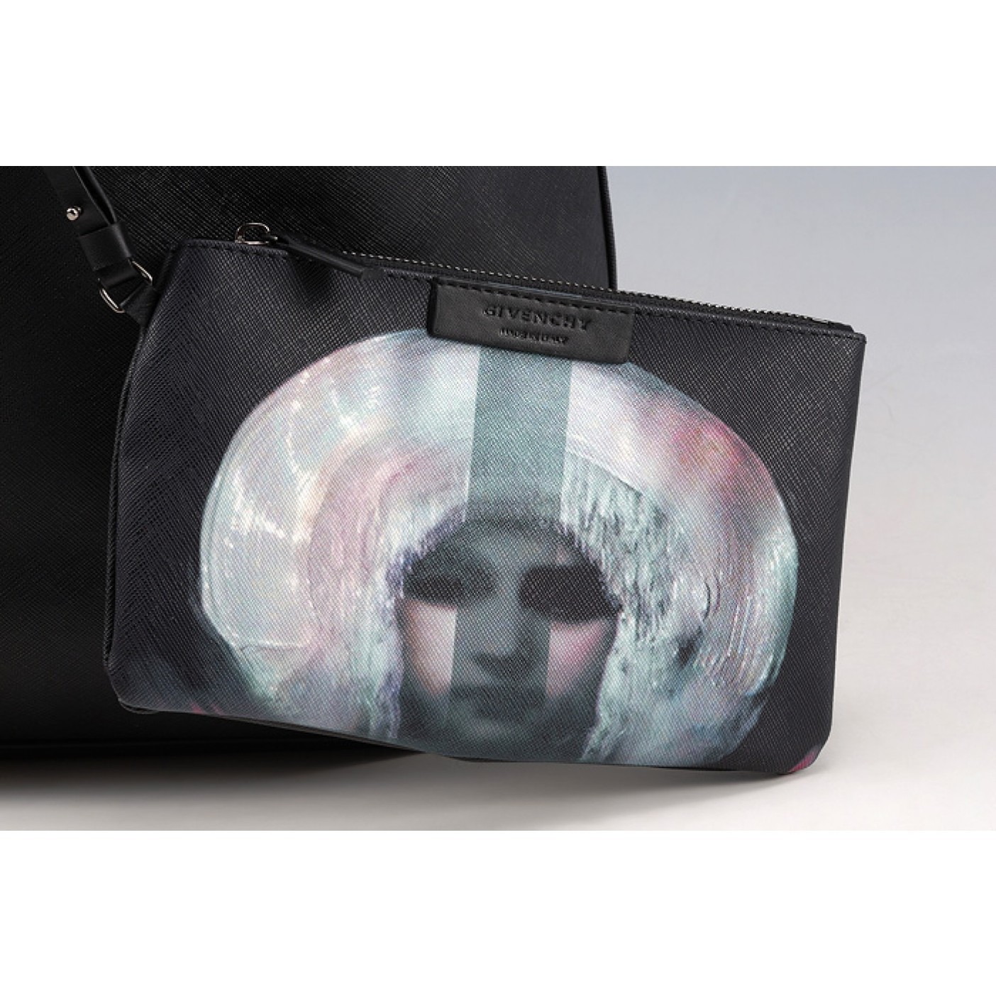 Exterior Black leather exterior with Madonna graphic in front, oxidized metal Givenchy initials leather tab in the top center front and two flat leather arm-carry straps