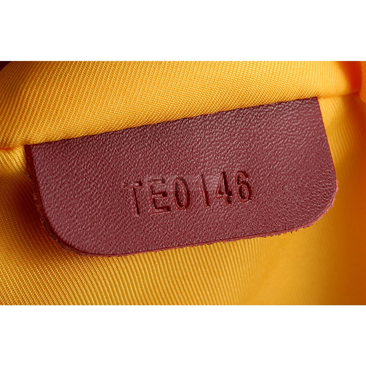 Exterior Dark red calfskin leather flat exterior with curved edges at the base, dark red leather trimmings, 3D black, brown and white Y-pattern print and zipper closure