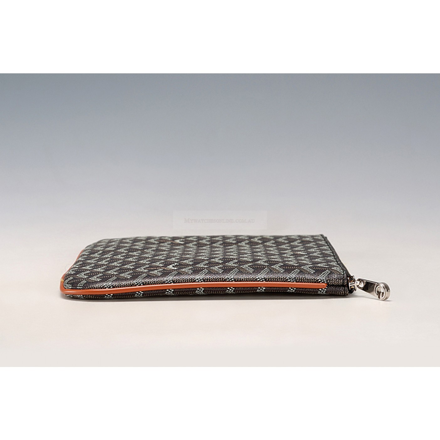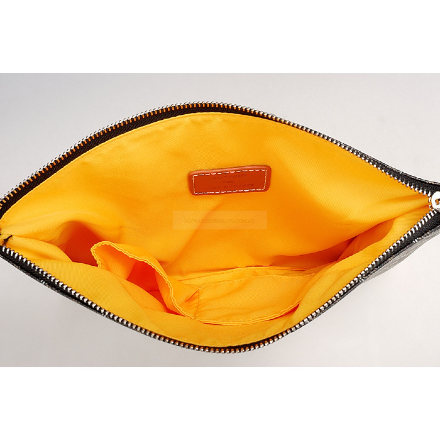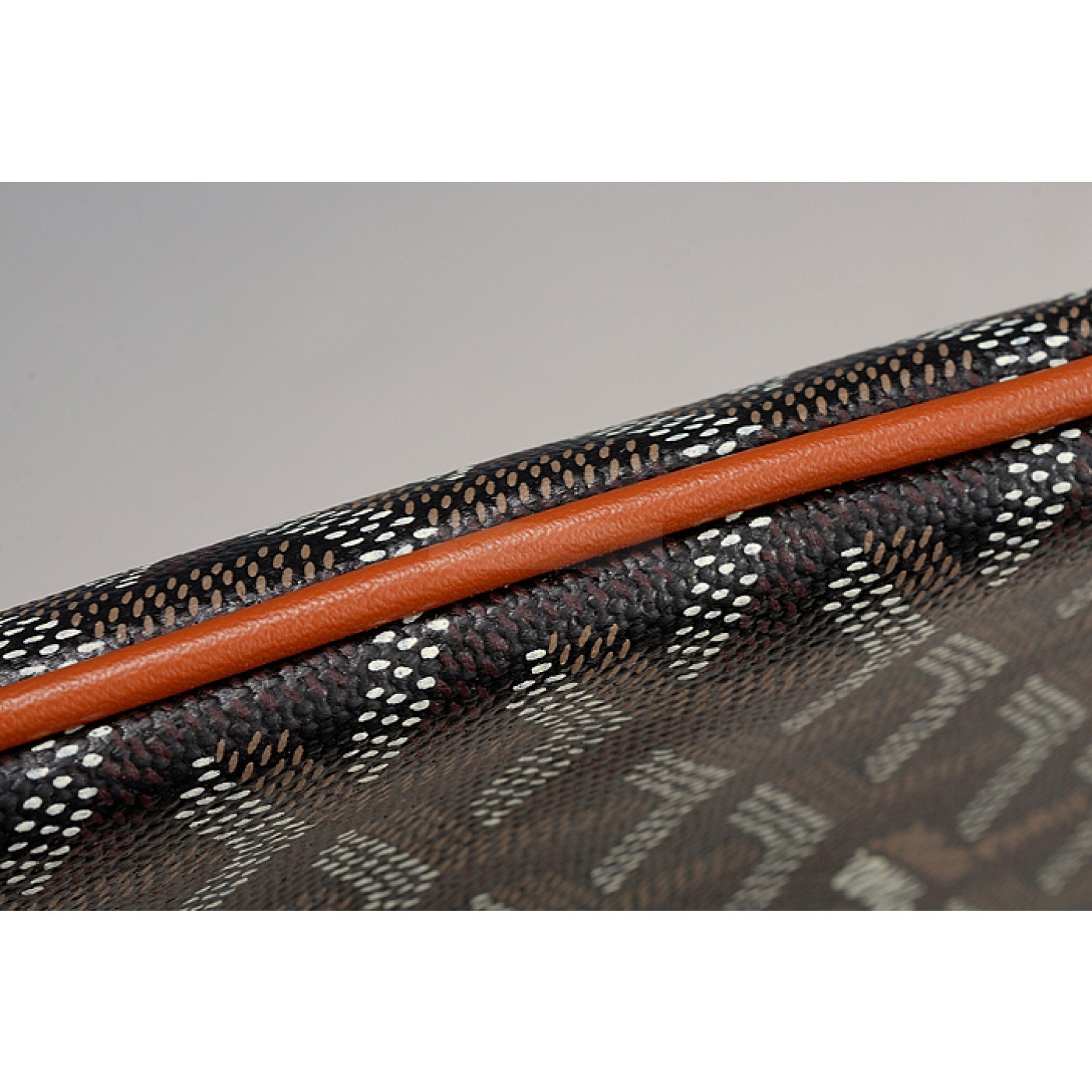 Description The thin tan leather trimming along the edges adds a dash of color to this smart Goyard pouch