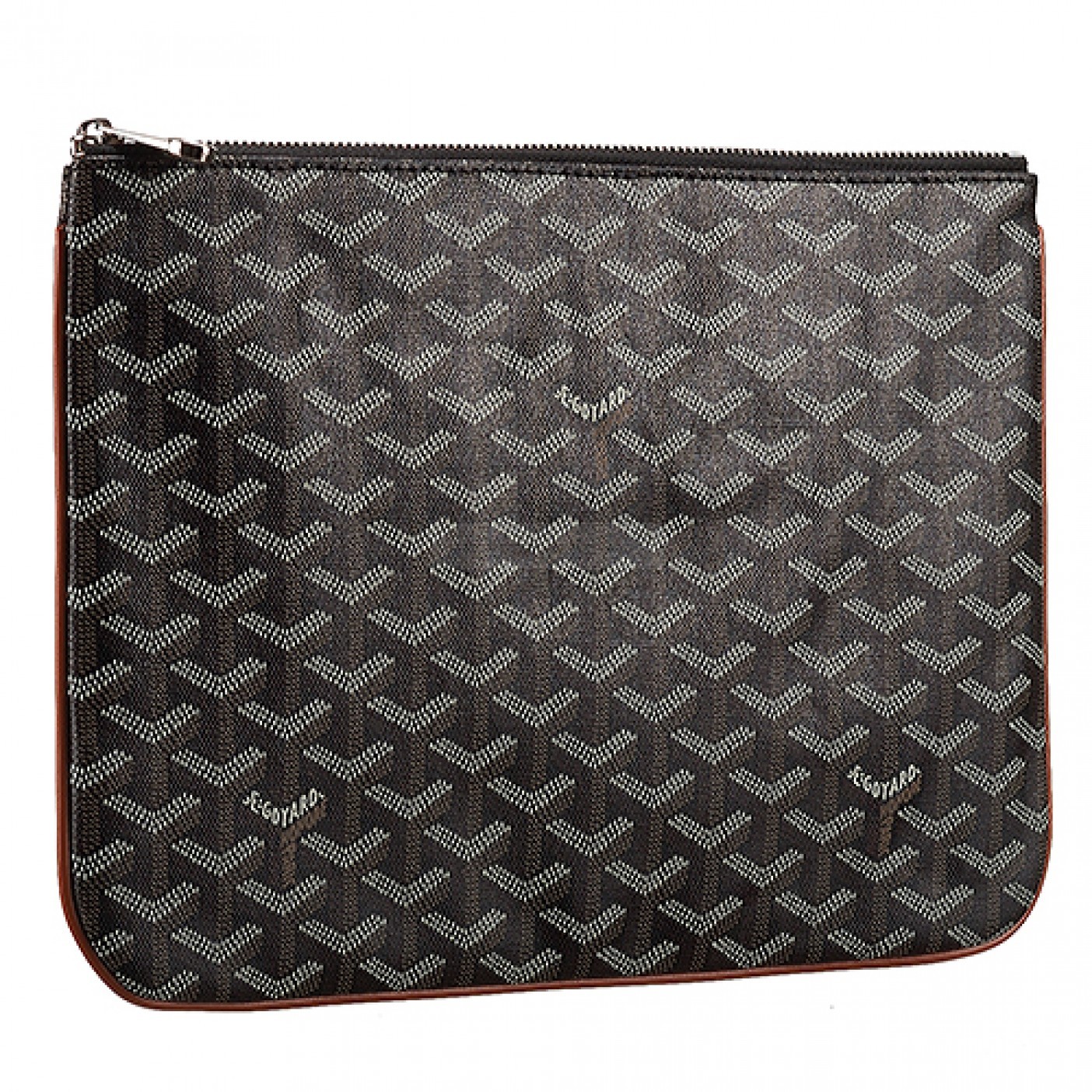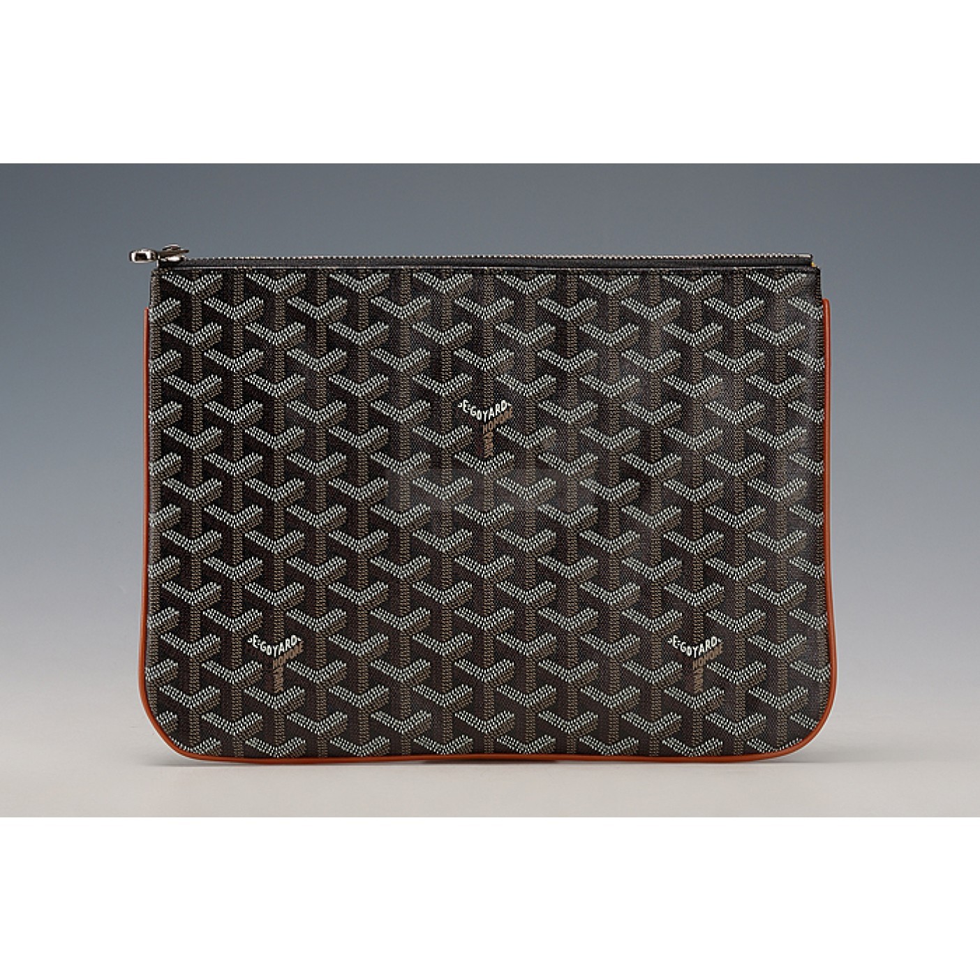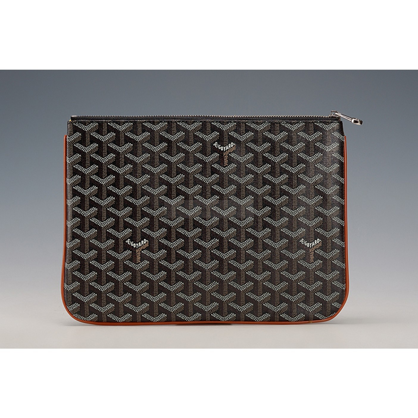 Description The thin tan leather trimming along the edges adds a dash of color to this smart Goyard pouch
