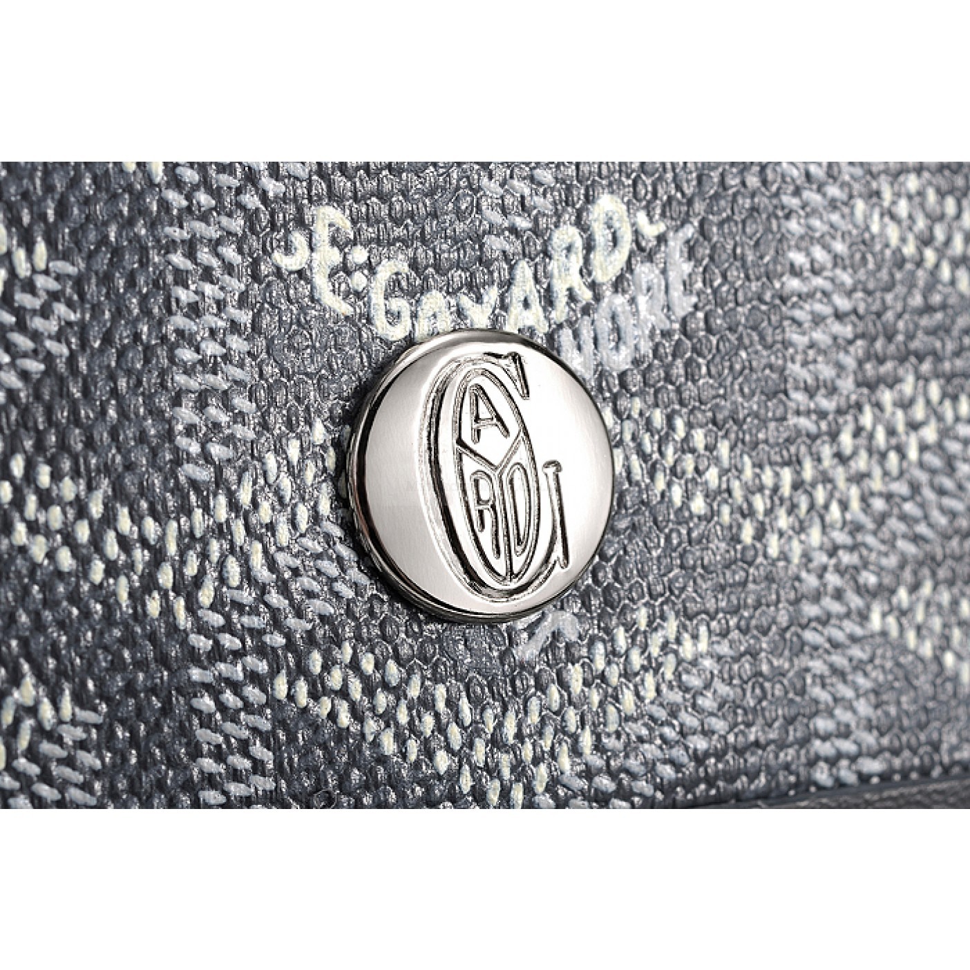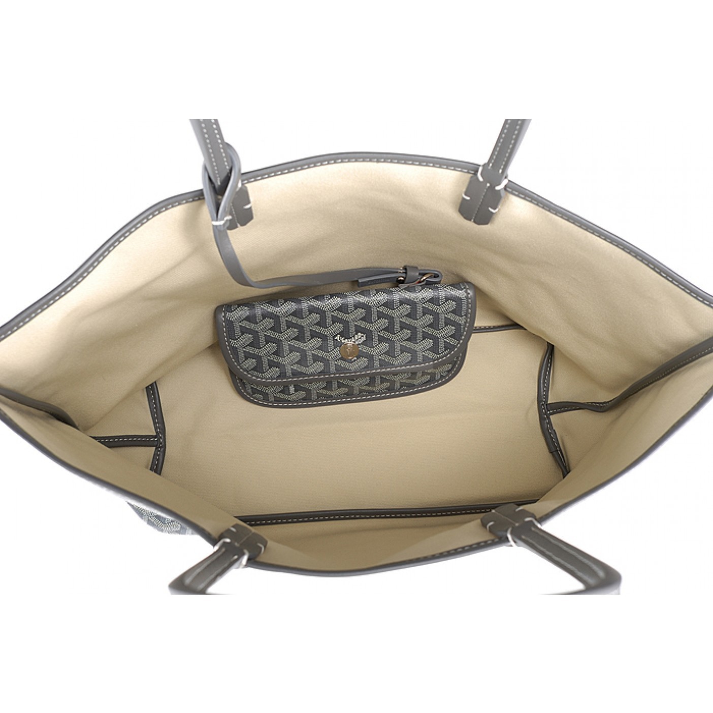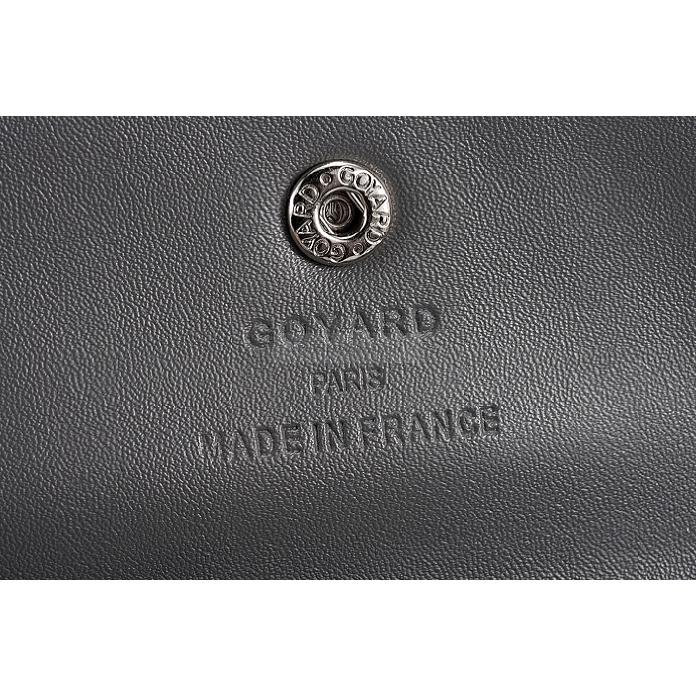 Interior Textile lining with Goyard Paris Made in France heat embossed on leather trim inside the coin purse