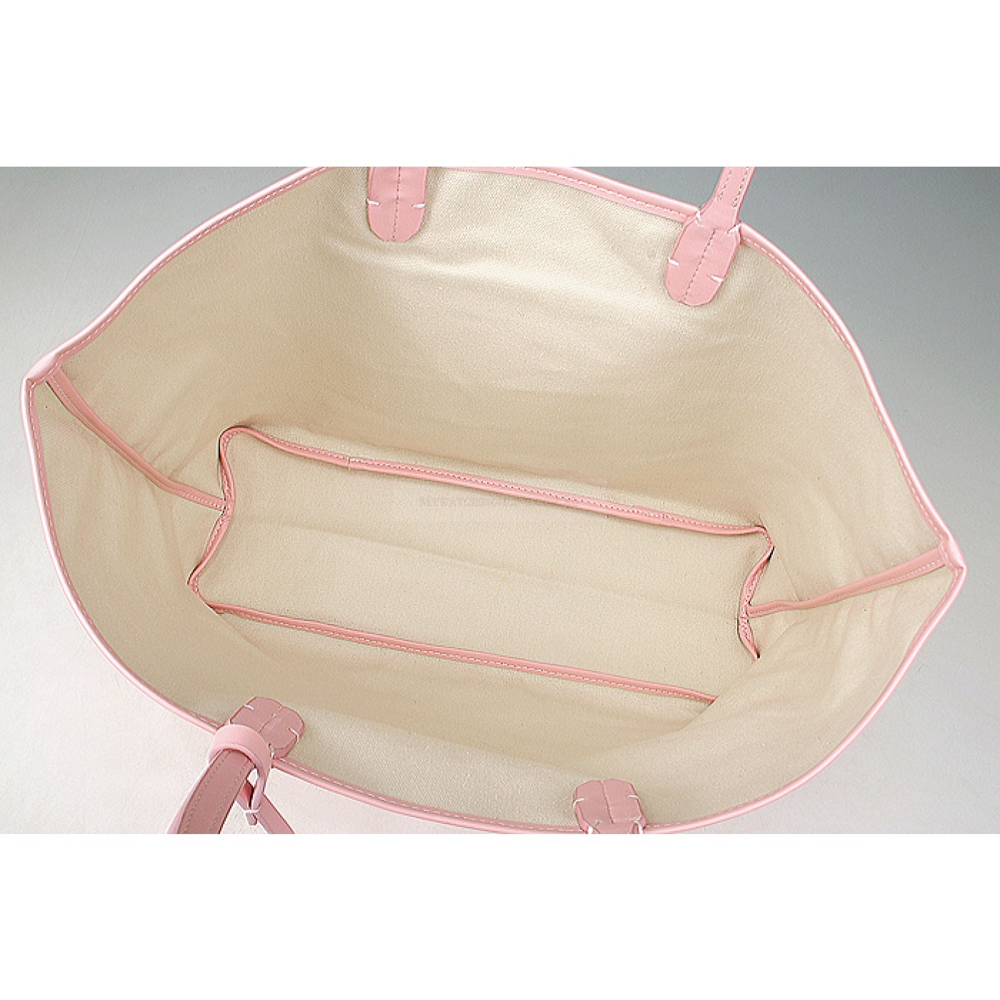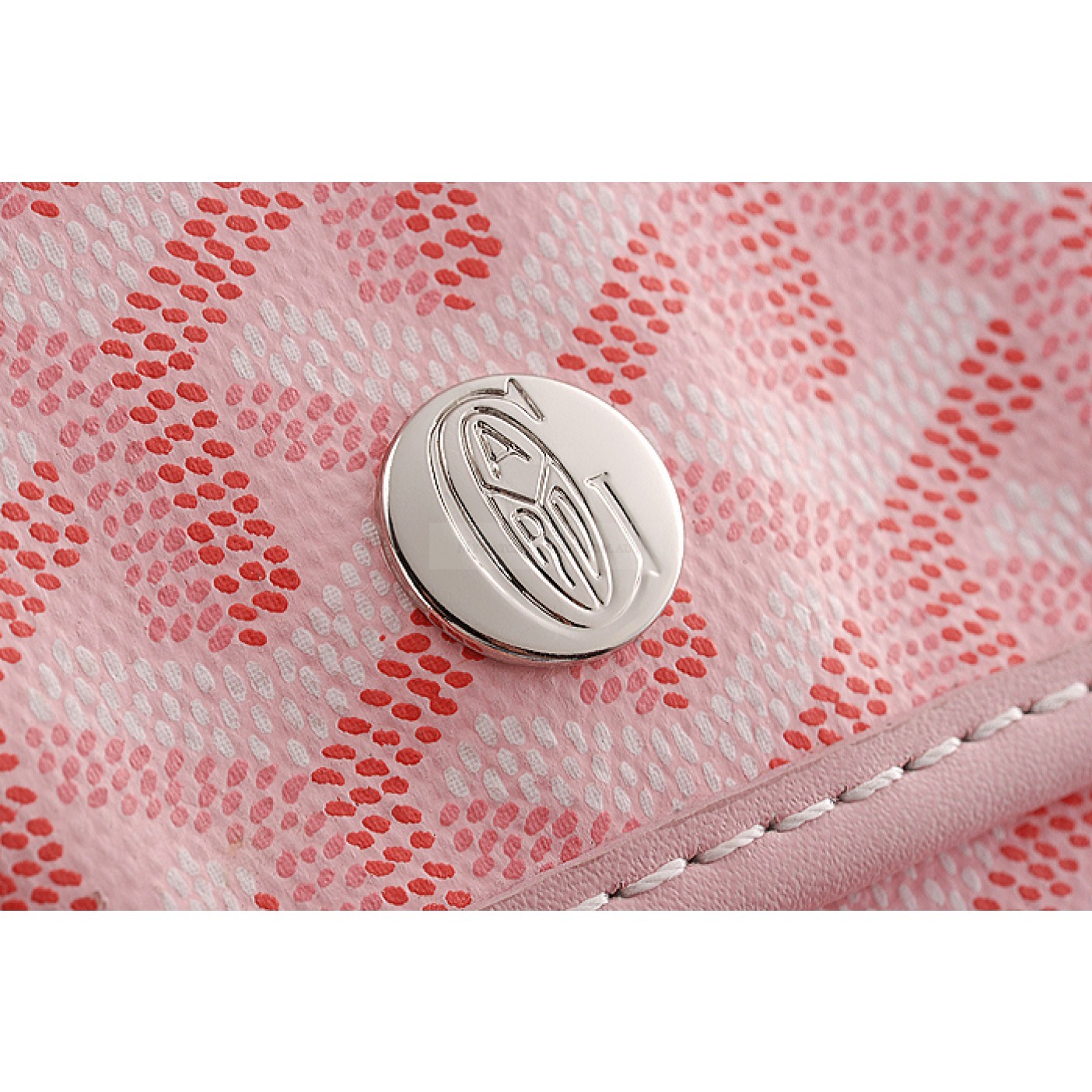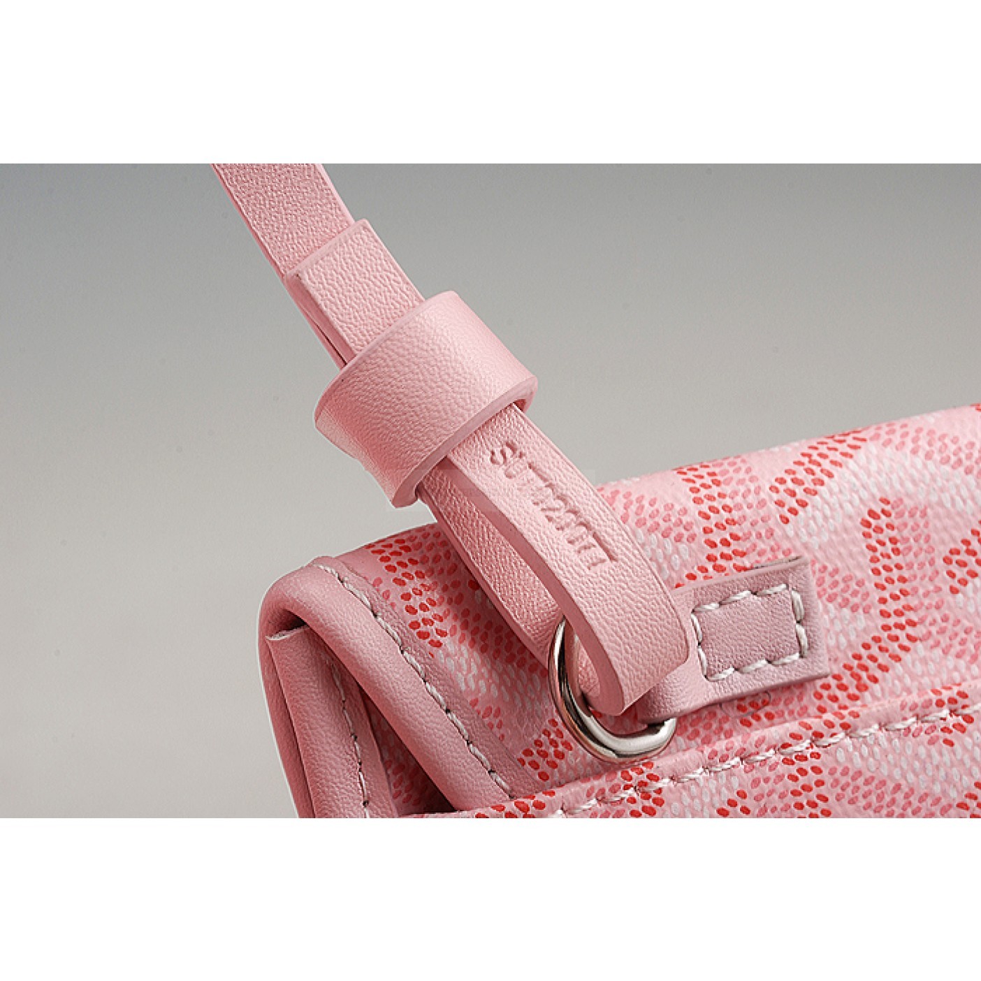 Exterior Pink coated canvas exterior with dotted chevron pattern print, a detachable coin purse that can be slung outside or kept safely inside bag and two ultra-slim flat leather arm-carry straps