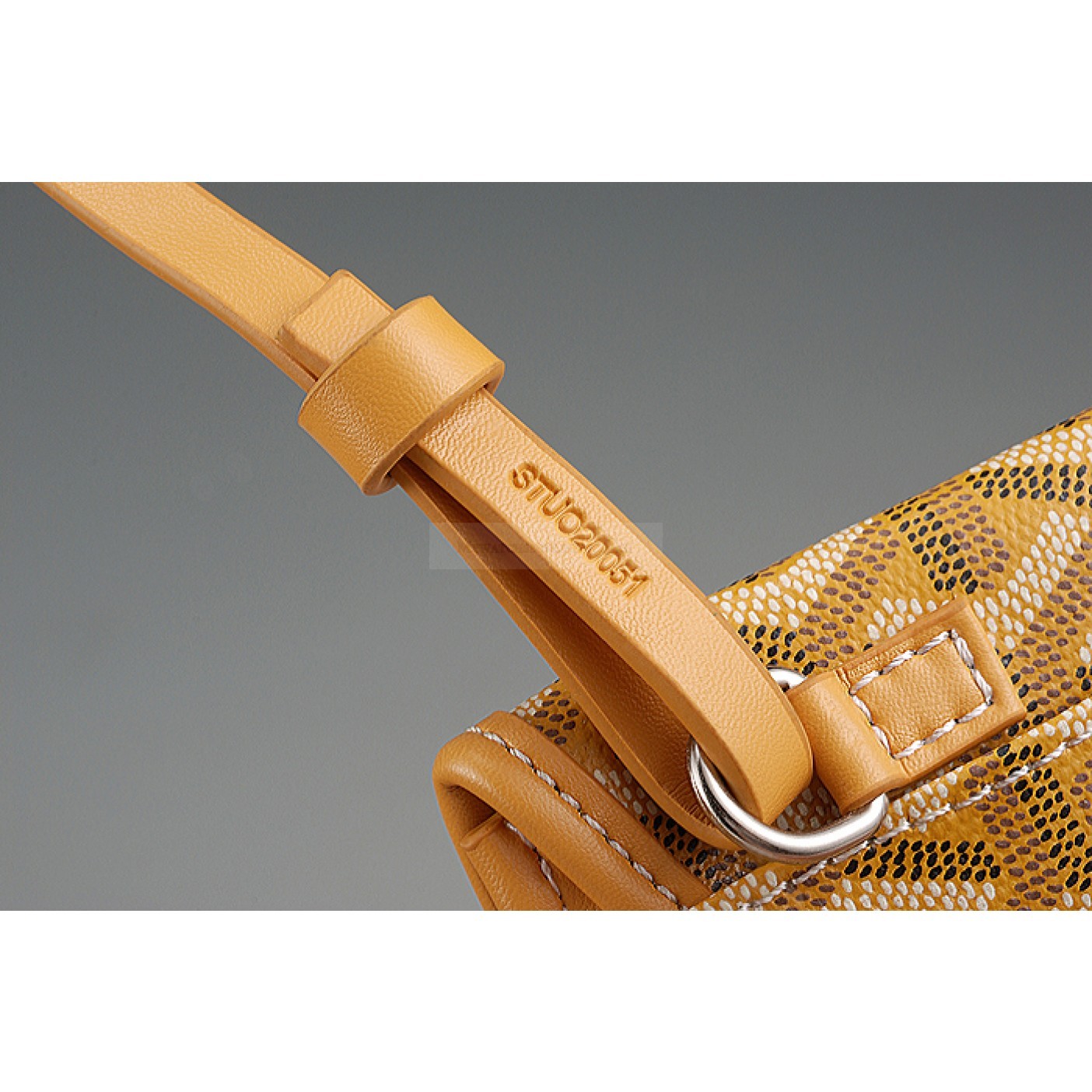 Exterior Yellow coated canvas exterior with dotted chevron pattern print, a detachable coin purse that can be slung outside or kept safely inside bag and two ultra-slim flat leather arm-carry straps