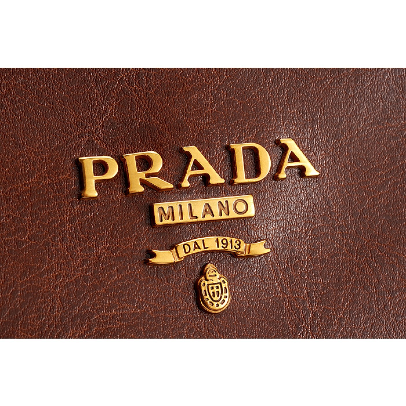 Exterior Brown lambskin leather exterior with wide base, antique finish brass Prada Milano and insignia at the top center front, a detachable leather name tag, two ultra-slim rounded leather handles and a hook-buckle adjustable and detachable leather shoulder strap