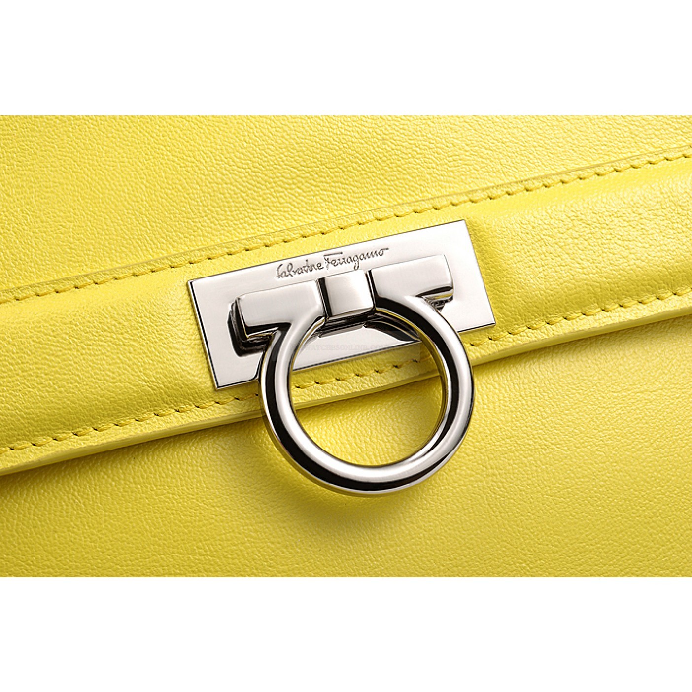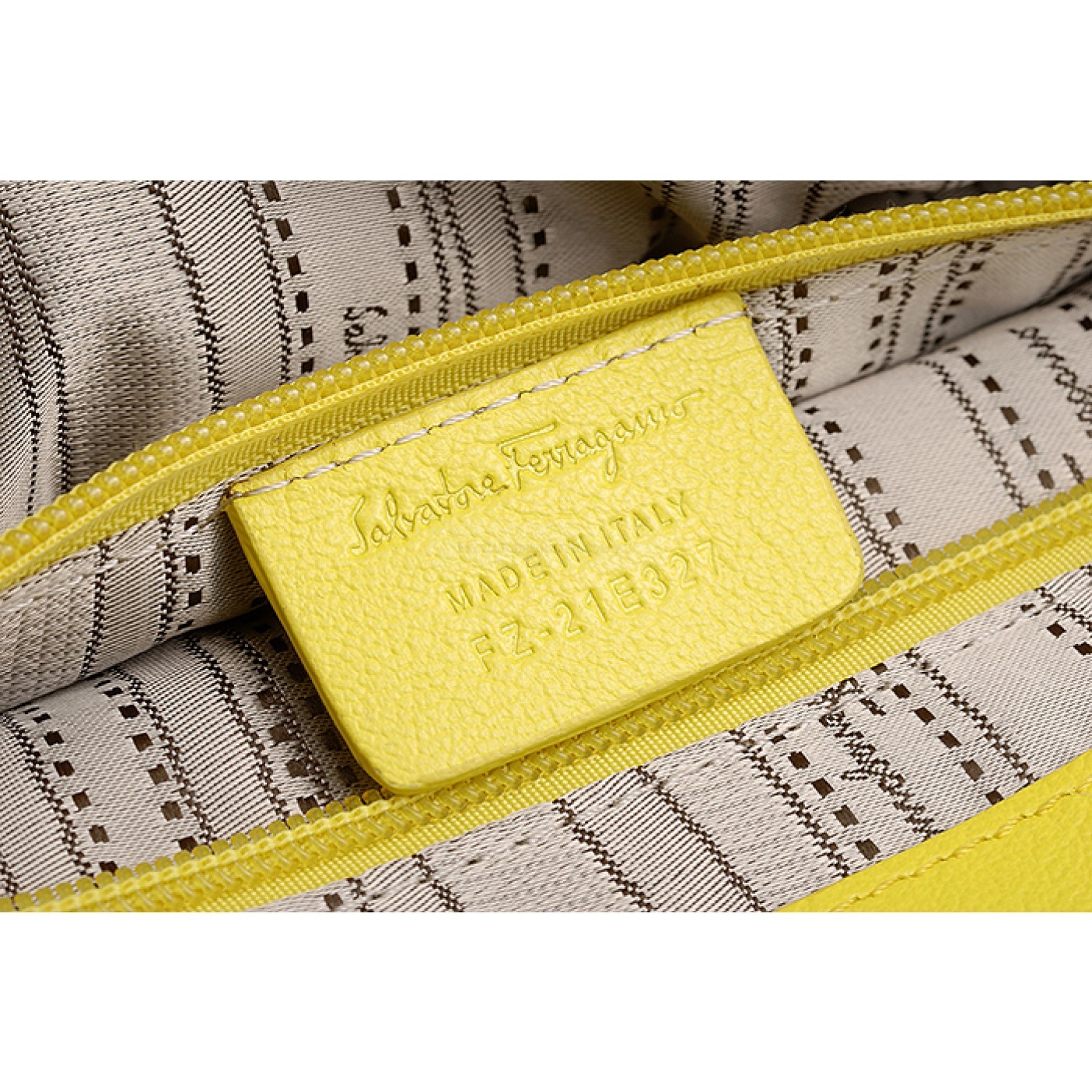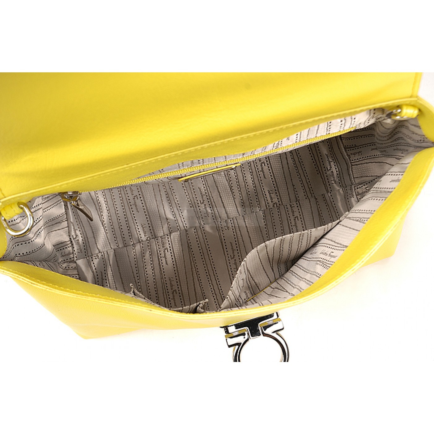 Exterior Yellow cowhide leather exterior with wide base, turned up sides attached to a polished white metal buckle, flip-over flap closure with polished white metal Salvatore Ferragamo engraved loop buckle accent, a flat zipper pocket at the back, a slim rounded top leather handle and a hook-buckle adjustable and detachable leather shoulder strap