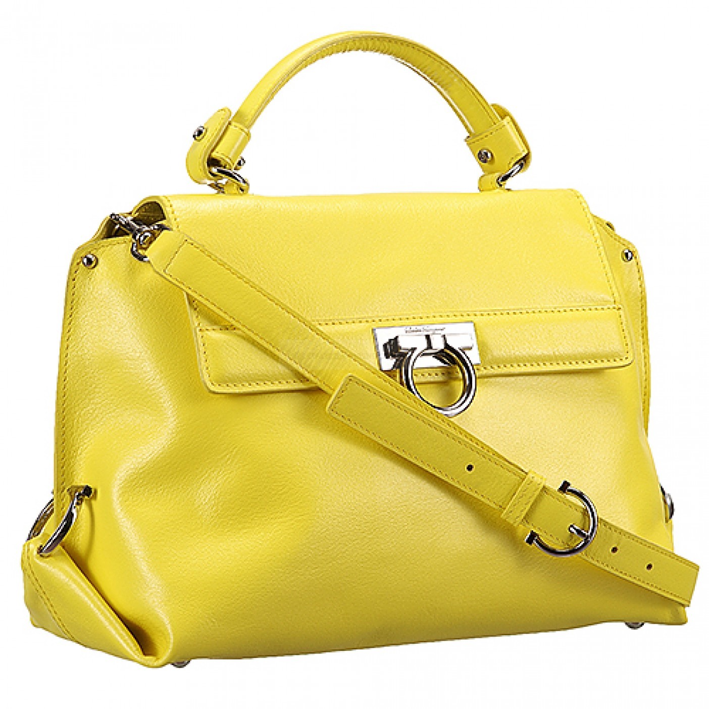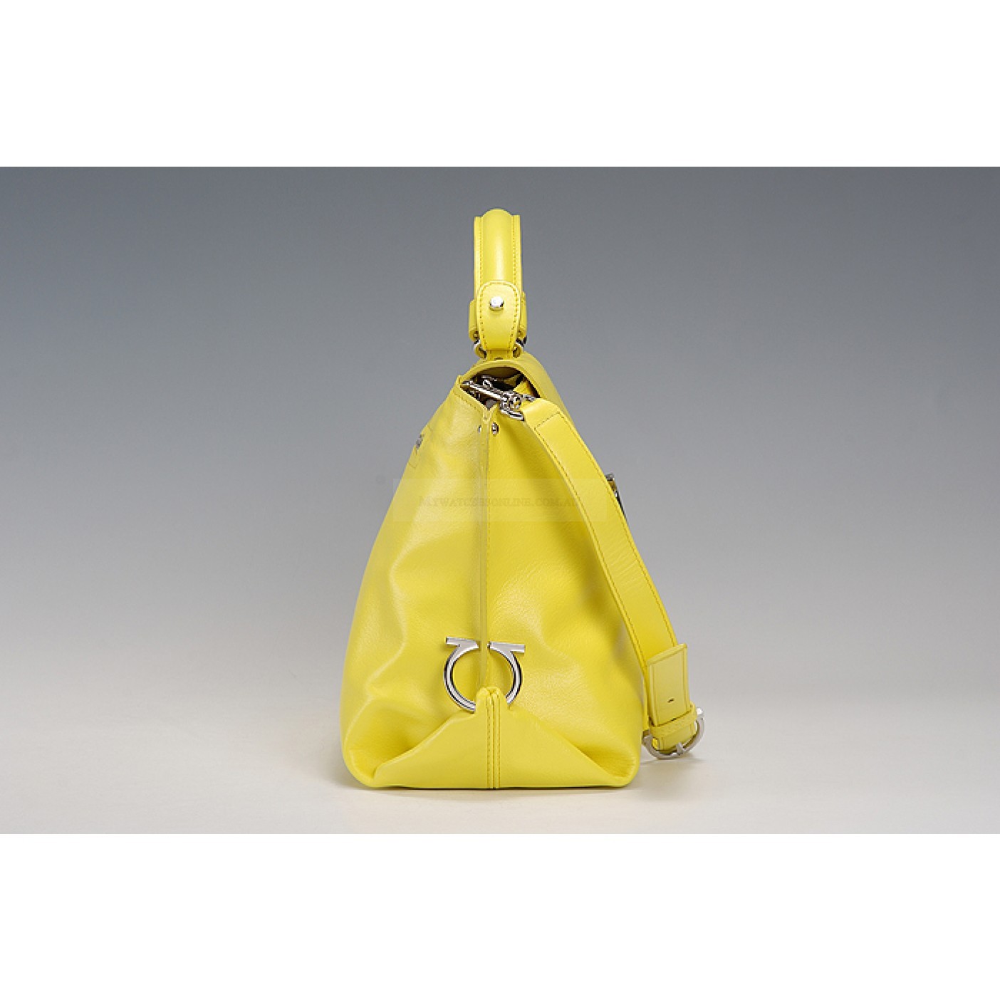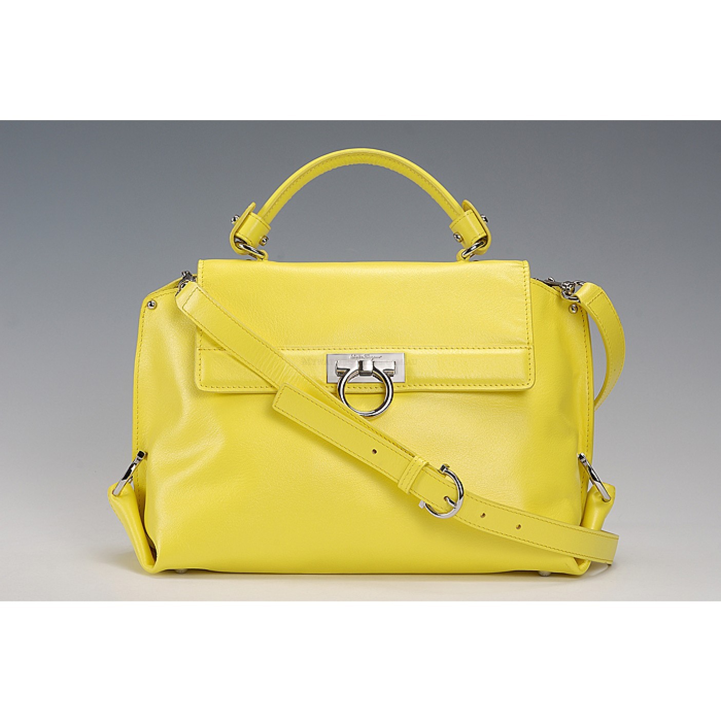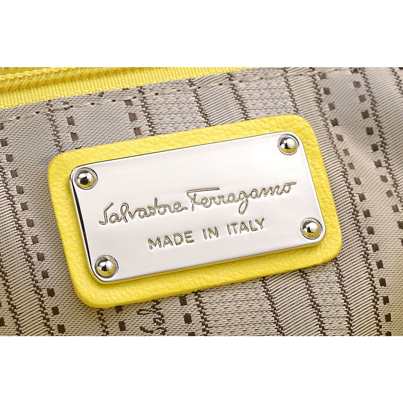 Exterior Yellow cowhide leather exterior with wide base, turned up sides attached to a polished white metal buckle, flip-over flap closure with polished white metal Salvatore Ferragamo engraved loop buckle accent, a flat zipper pocket at the back, a slim rounded top leather handle and a hook-buckle adjustable and detachable leather shoulder strap
