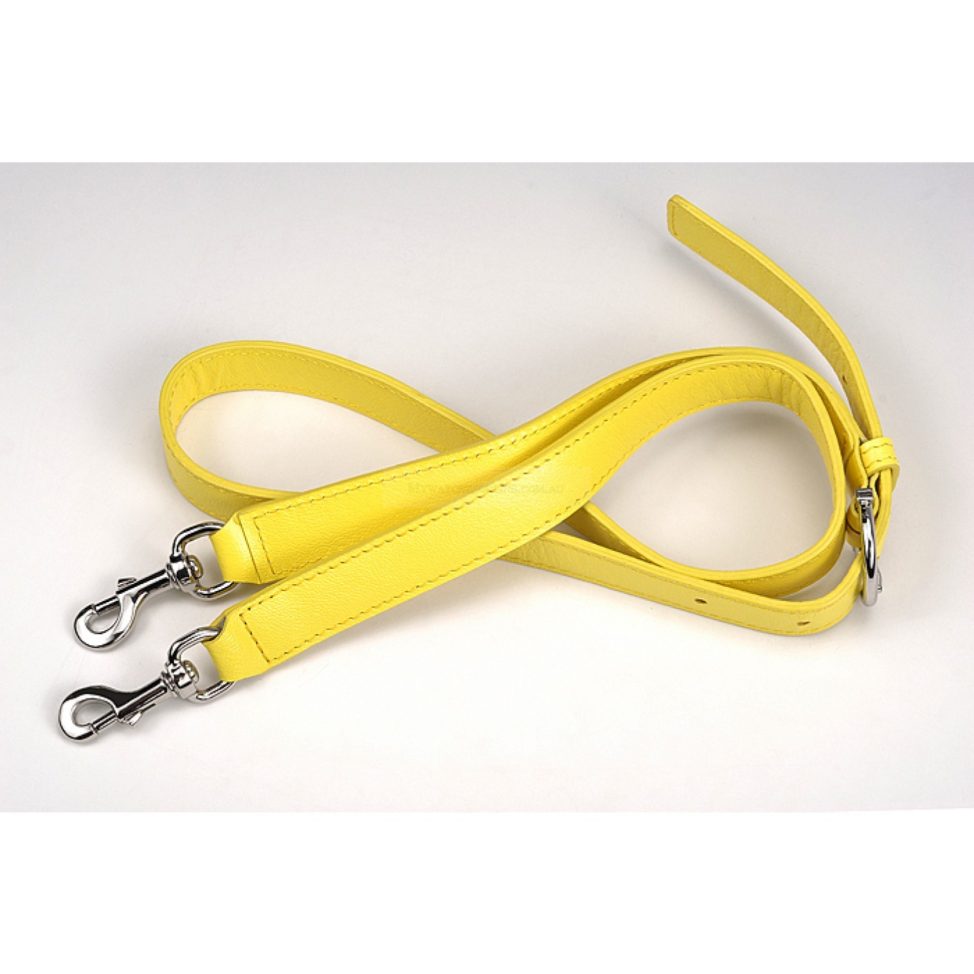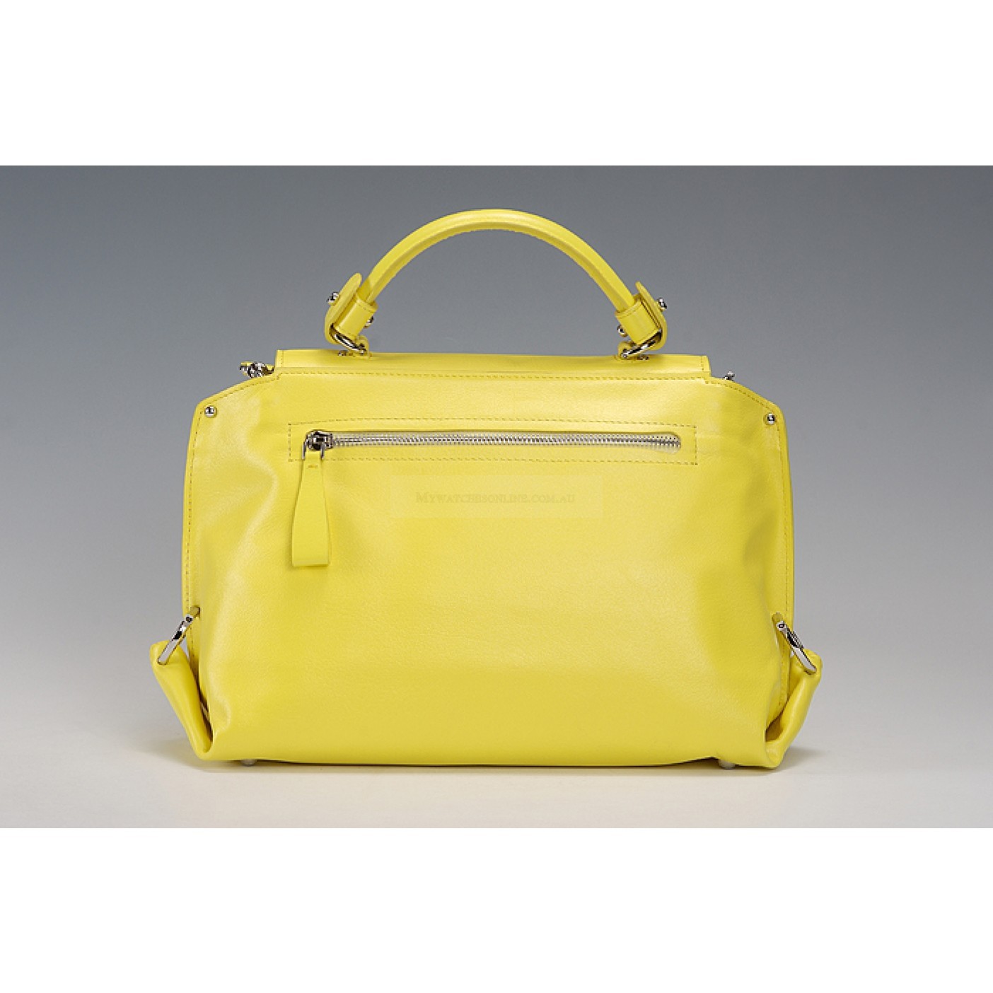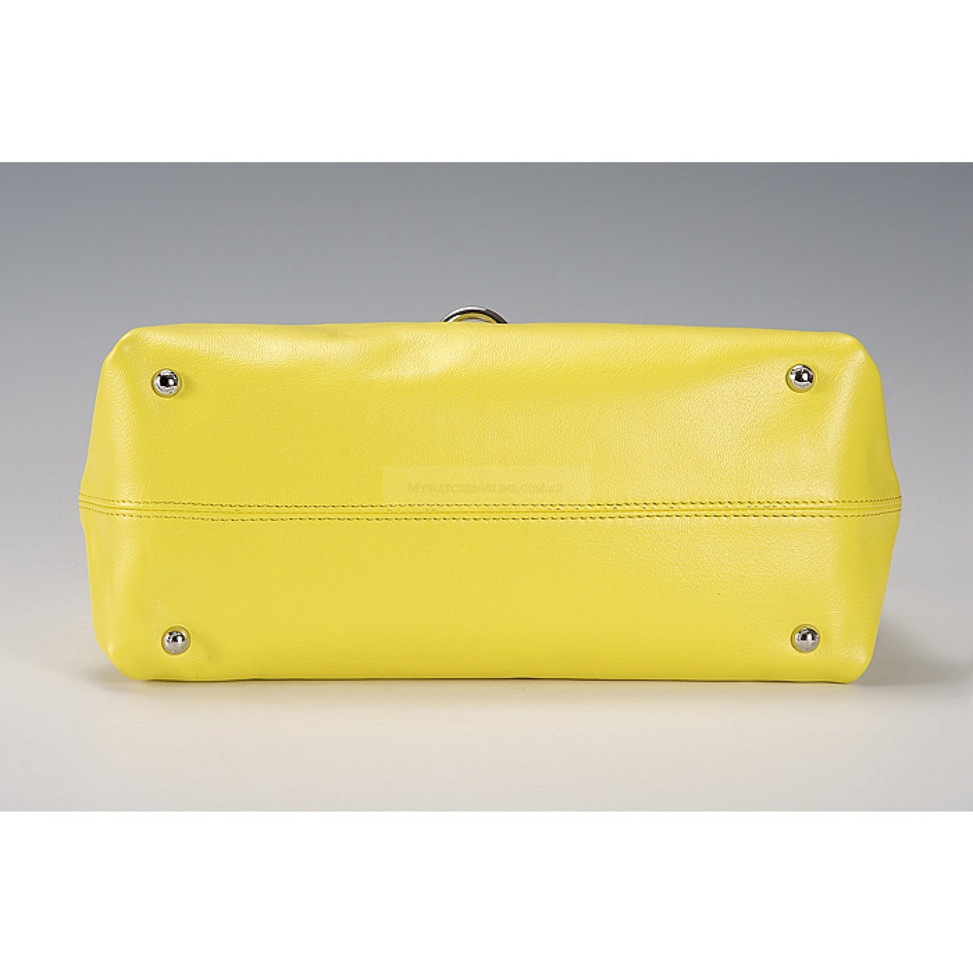 Description A smart-design handbag with polished white metal trimmings adding beauty to the yellow cowhide leather