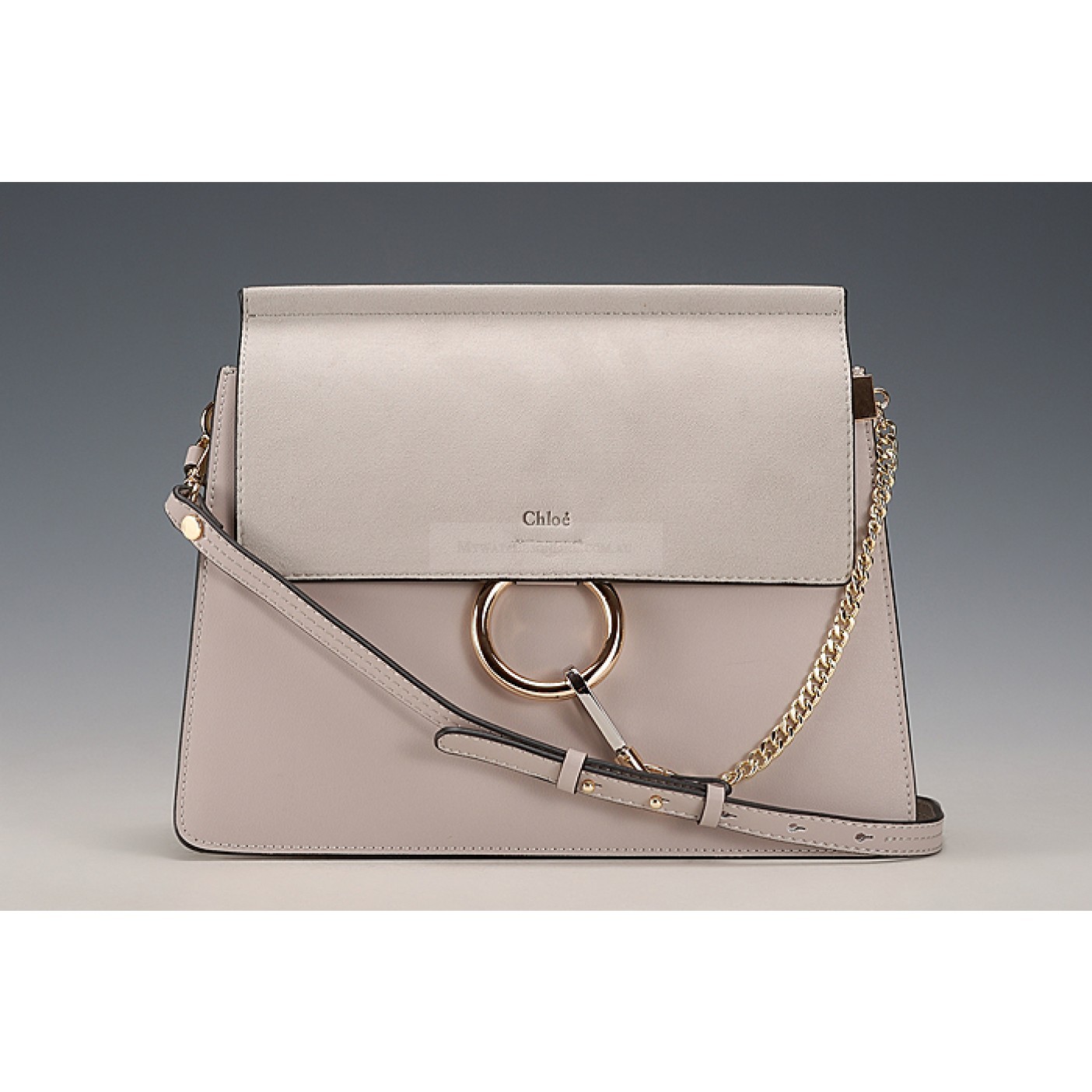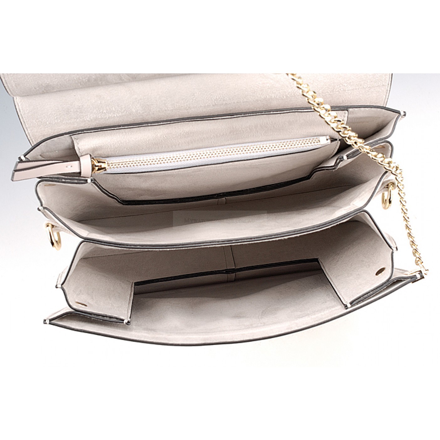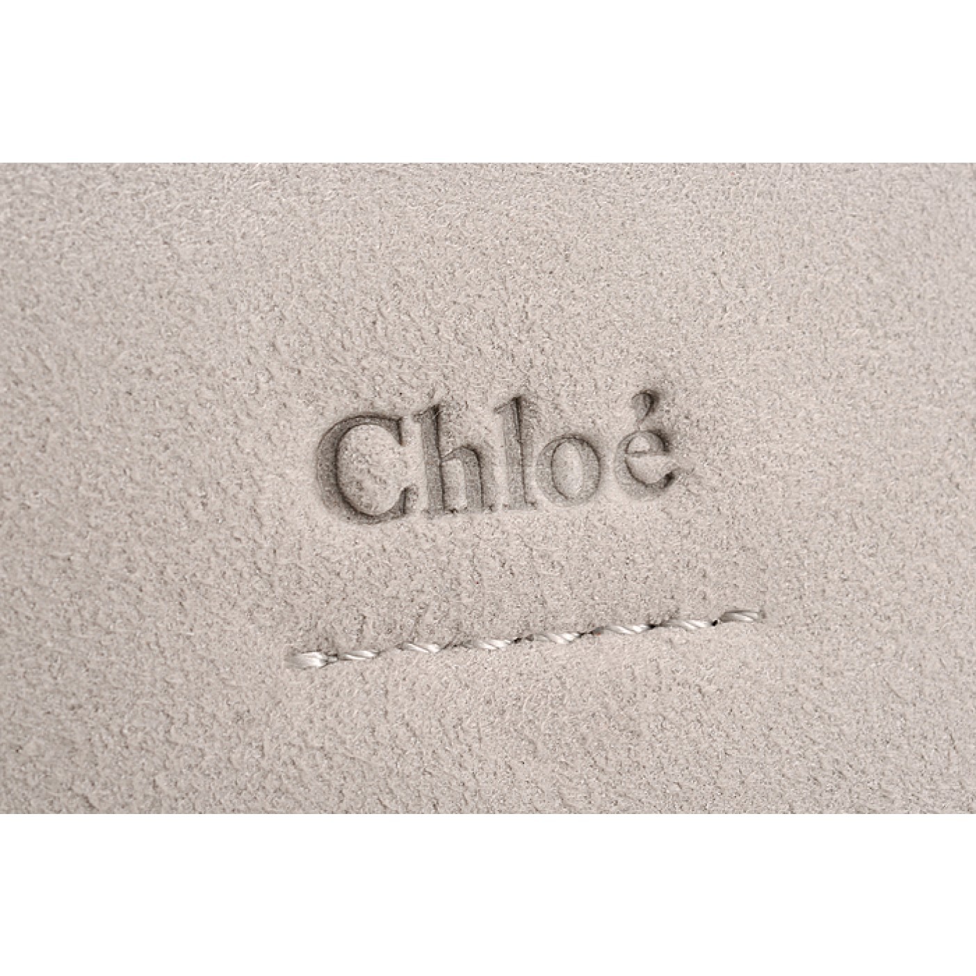 Exterior Grey calfskin leather exterior with long base and narrow indented top, a grey suede leather flip-over flap featuring a polished brass ring buckle and link chain swivel clasp closure, Chloe heat embossed on the flap at the back and a detachable and hook-buckle adjustable ultra thin leather shoulder strap