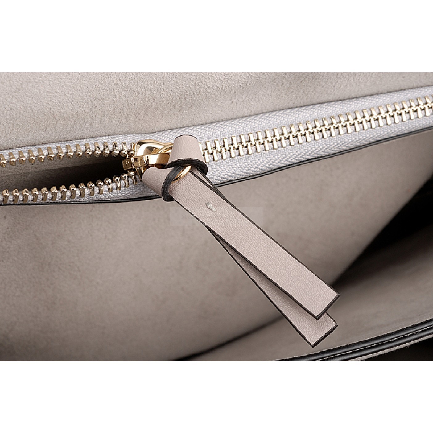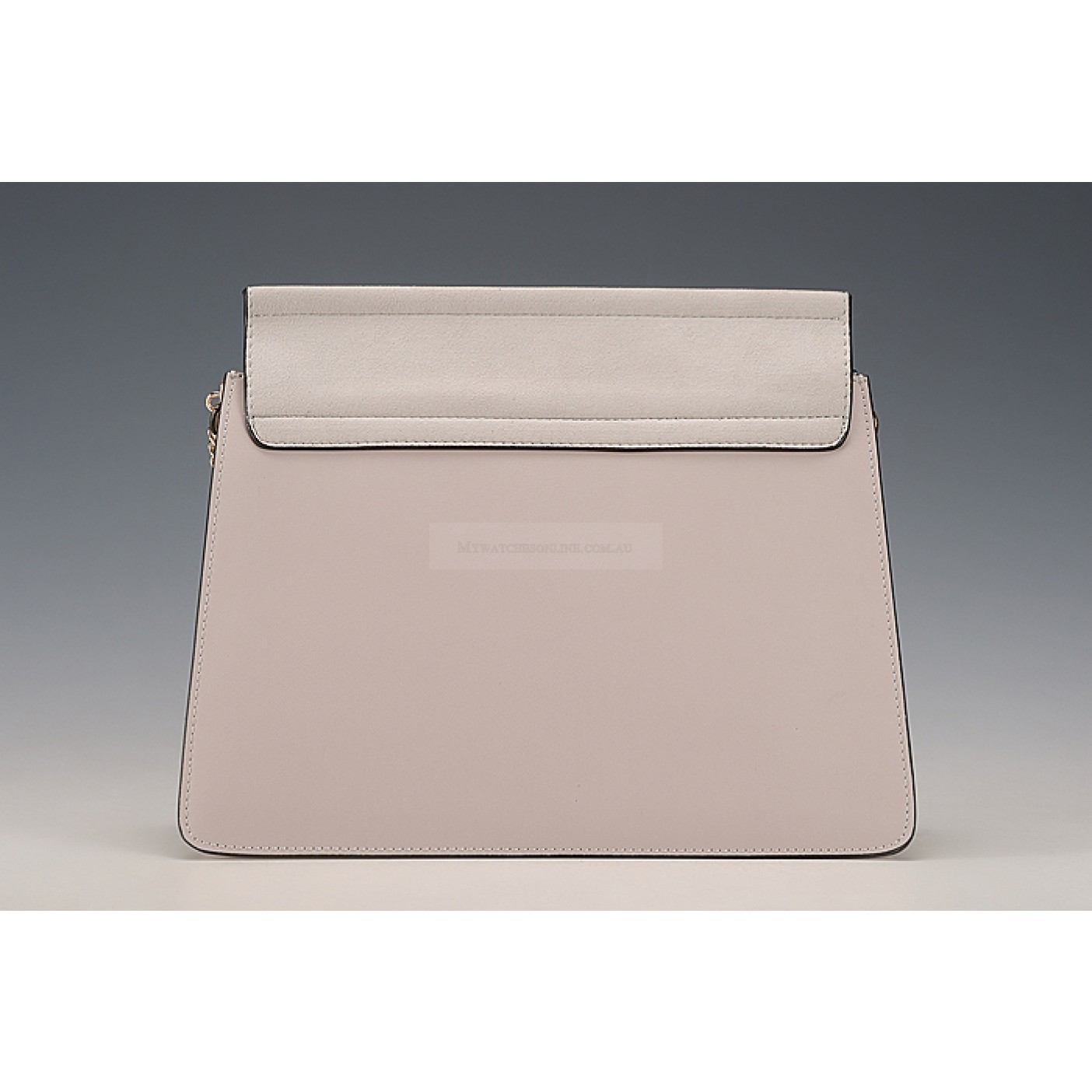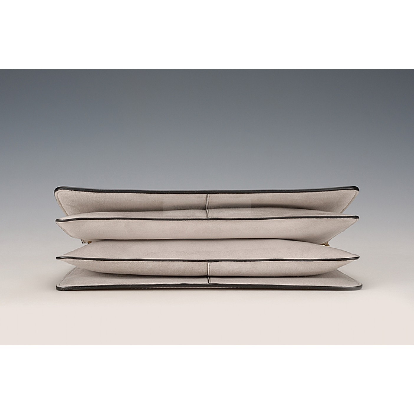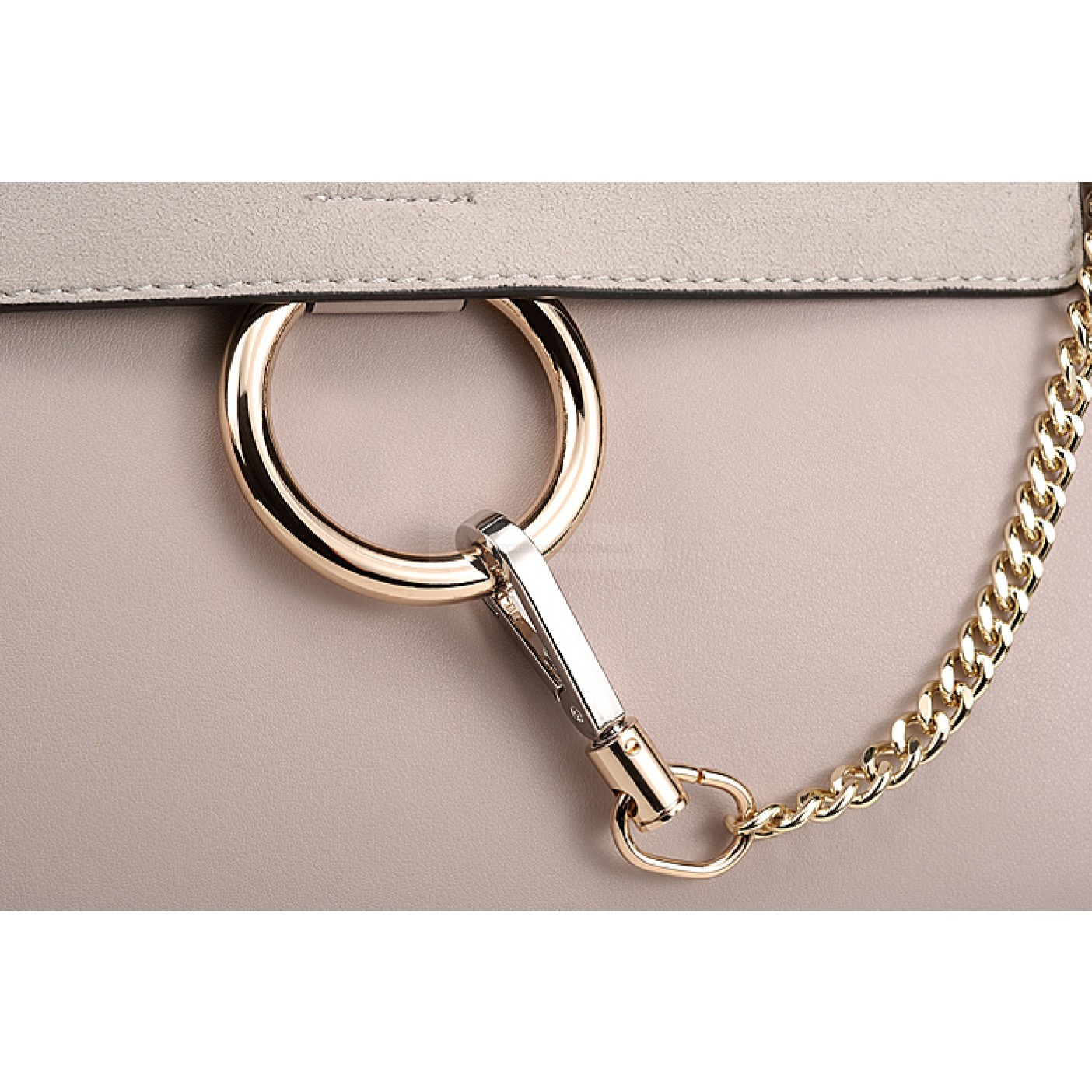 Exterior Grey calfskin leather exterior with long base and narrow indented top, a grey suede leather flip-over flap featuring a polished brass ring buckle and link chain swivel clasp closure, Chloe heat embossed on the flap at the back and a detachable and hook-buckle adjustable ultra thin leather shoulder strap