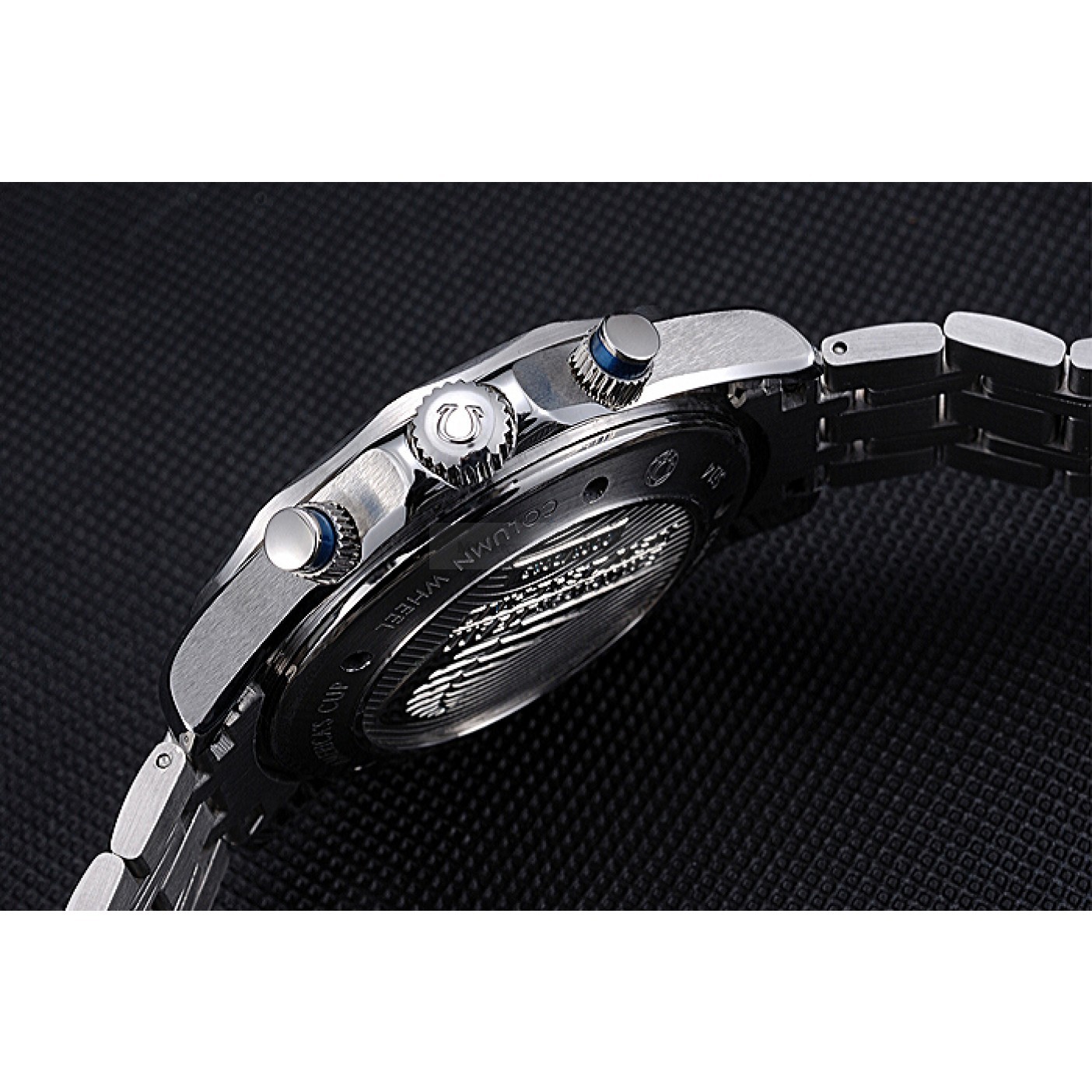 Crown Omega logo engraved polished stainless steel cutwork crown with black enamel strip round push button crown on either side of it plus a logo engraved polished stainless steel cutwork crown on opposite top corner