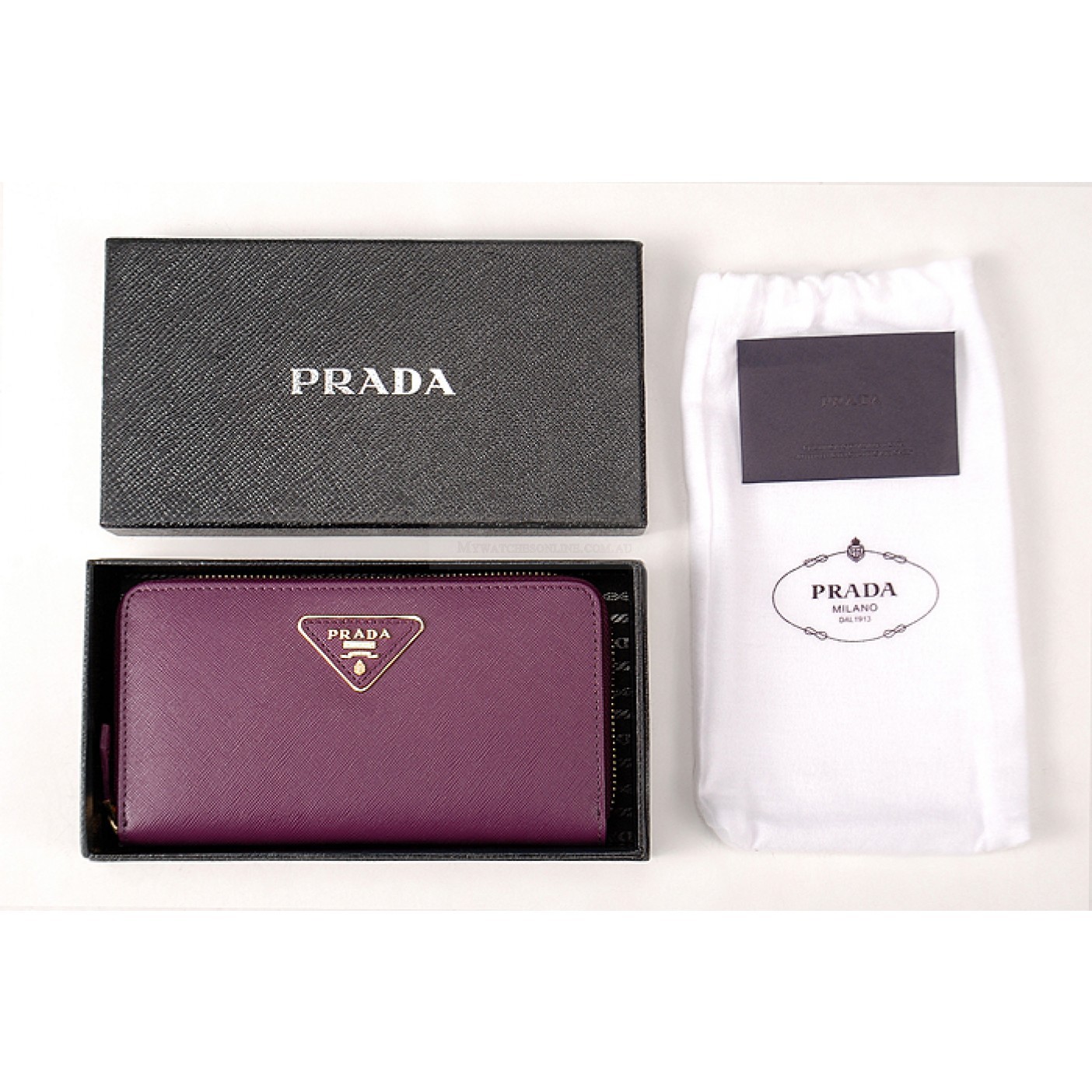 Exterior Purple leather exterior with Prada Milano and insignia polished brass and leather trim in the top center front and a zipper closure