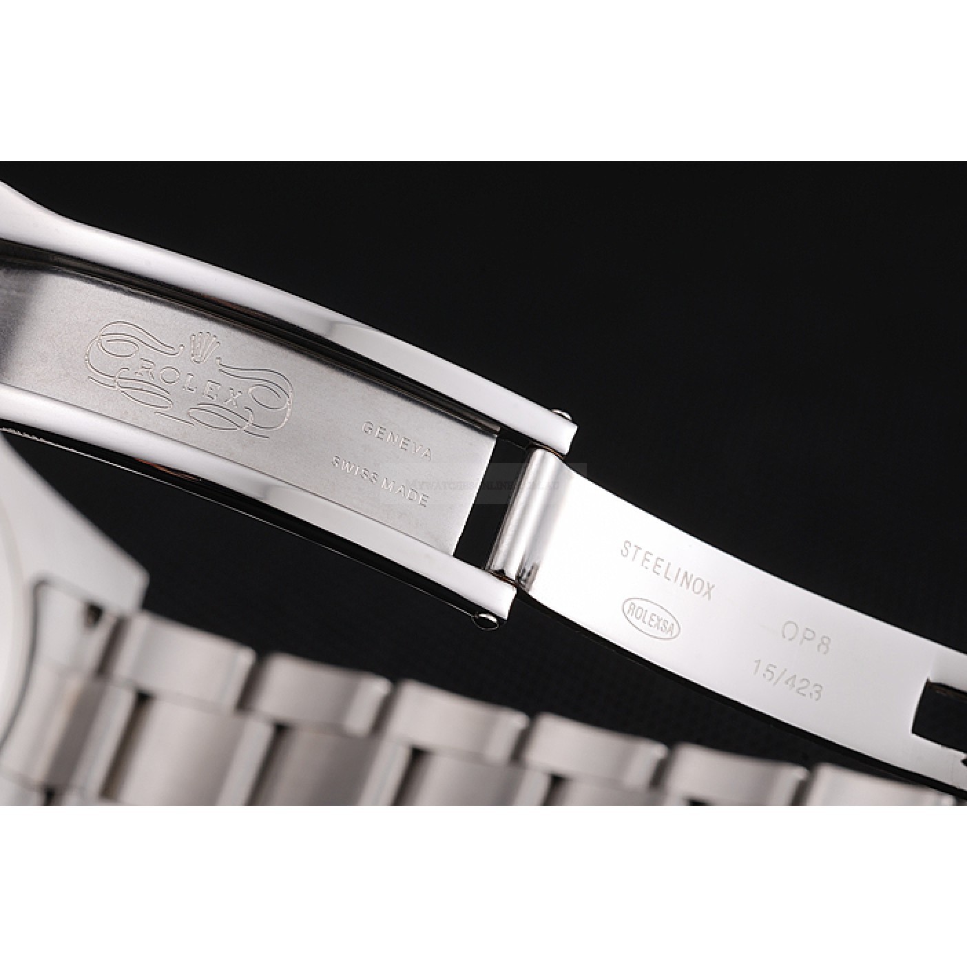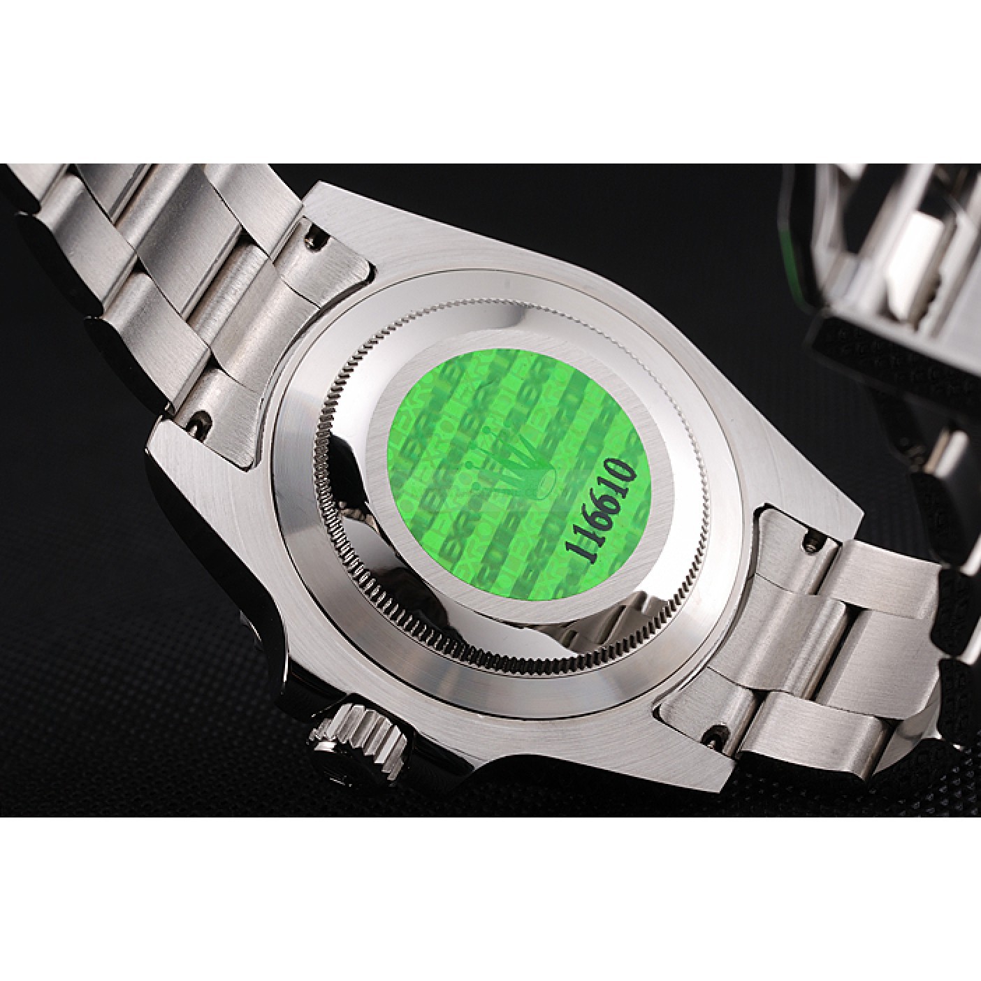 Back Brushed stainless steel snap-in back with green Rolex authenticity sticker