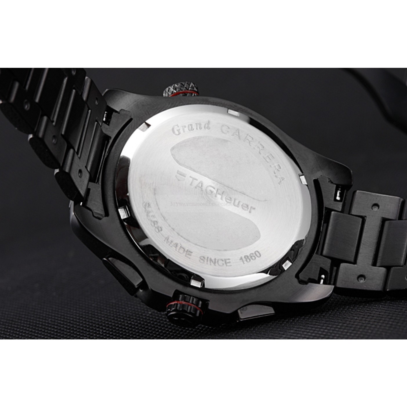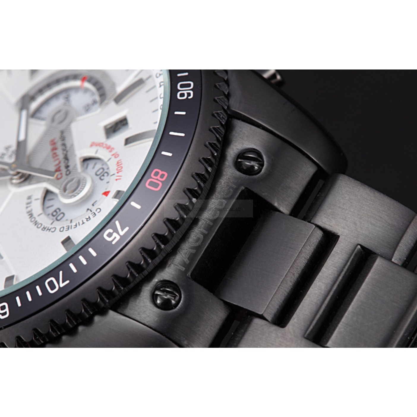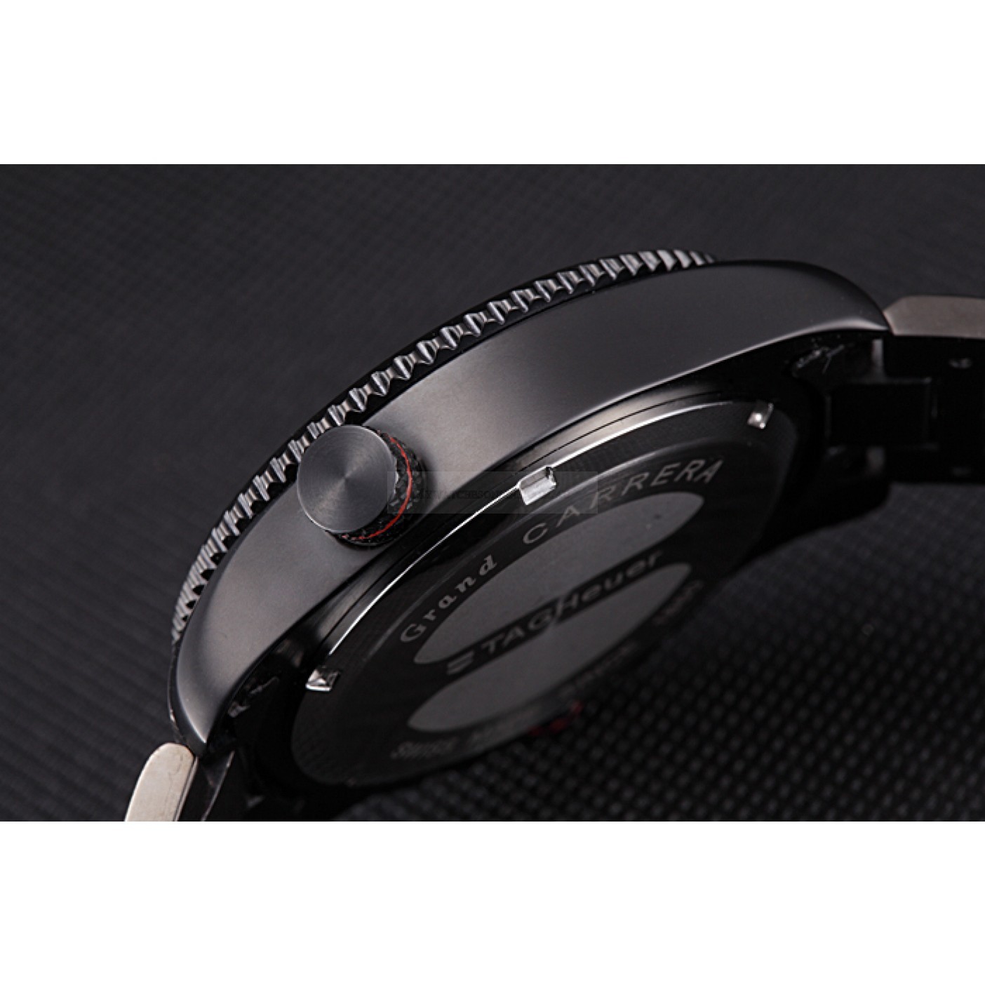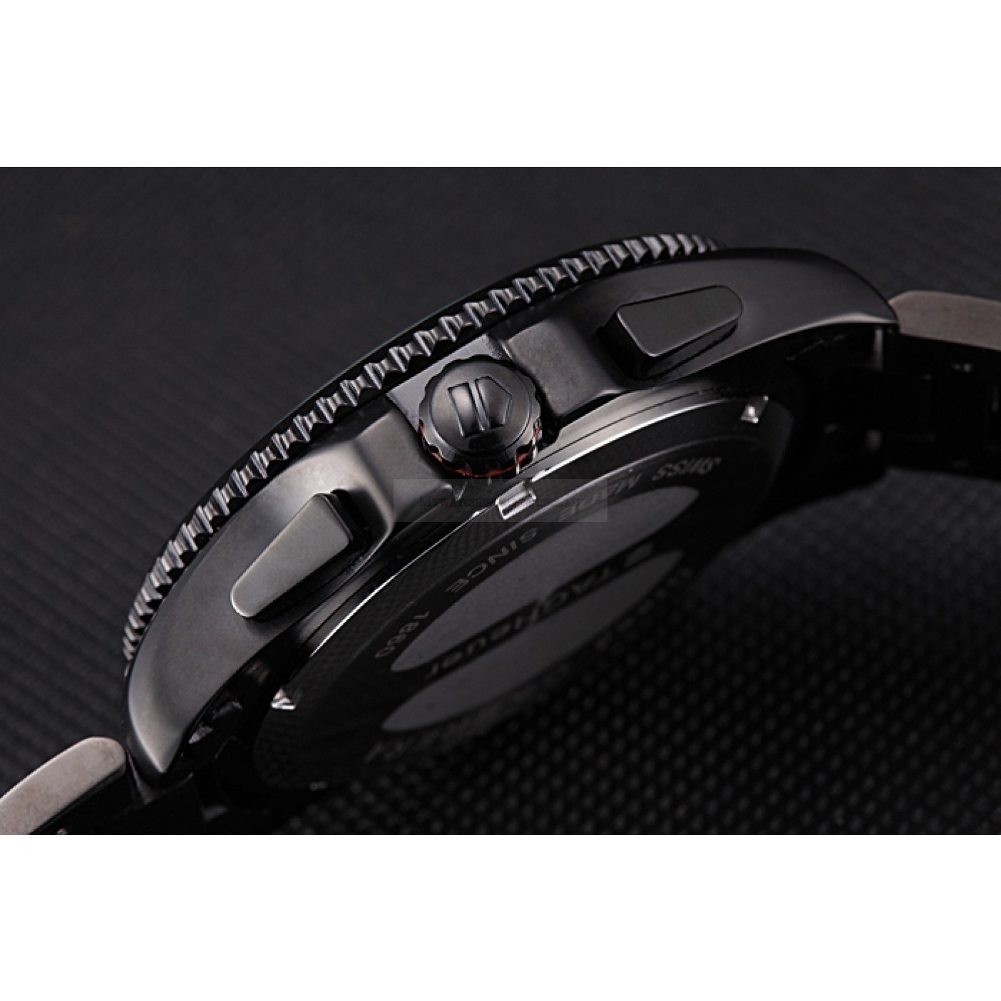 Crown Ion-plated cutwork crown with Tag Heuer logo and red band trim and two long push-button crowns on either side of it plus a logo engraved ion-plated crown with red band trim on the opposite top corner
