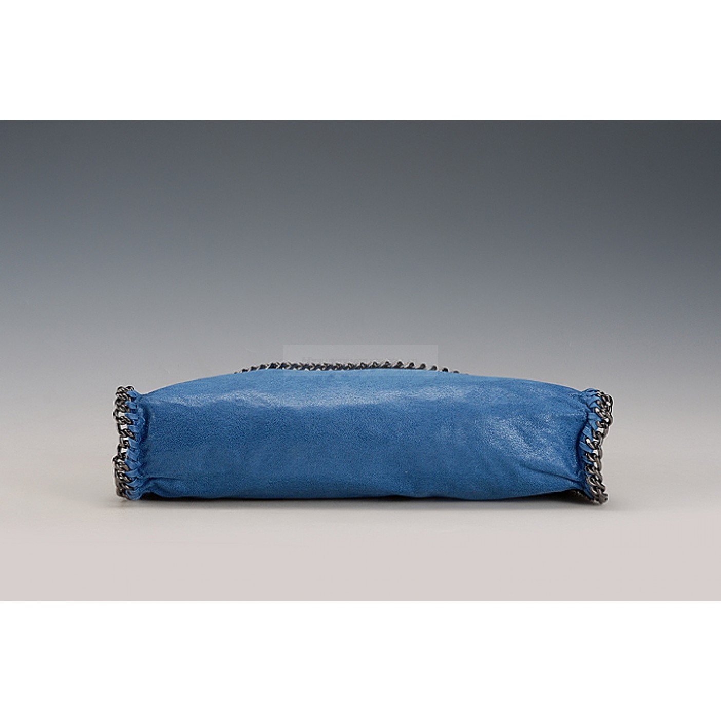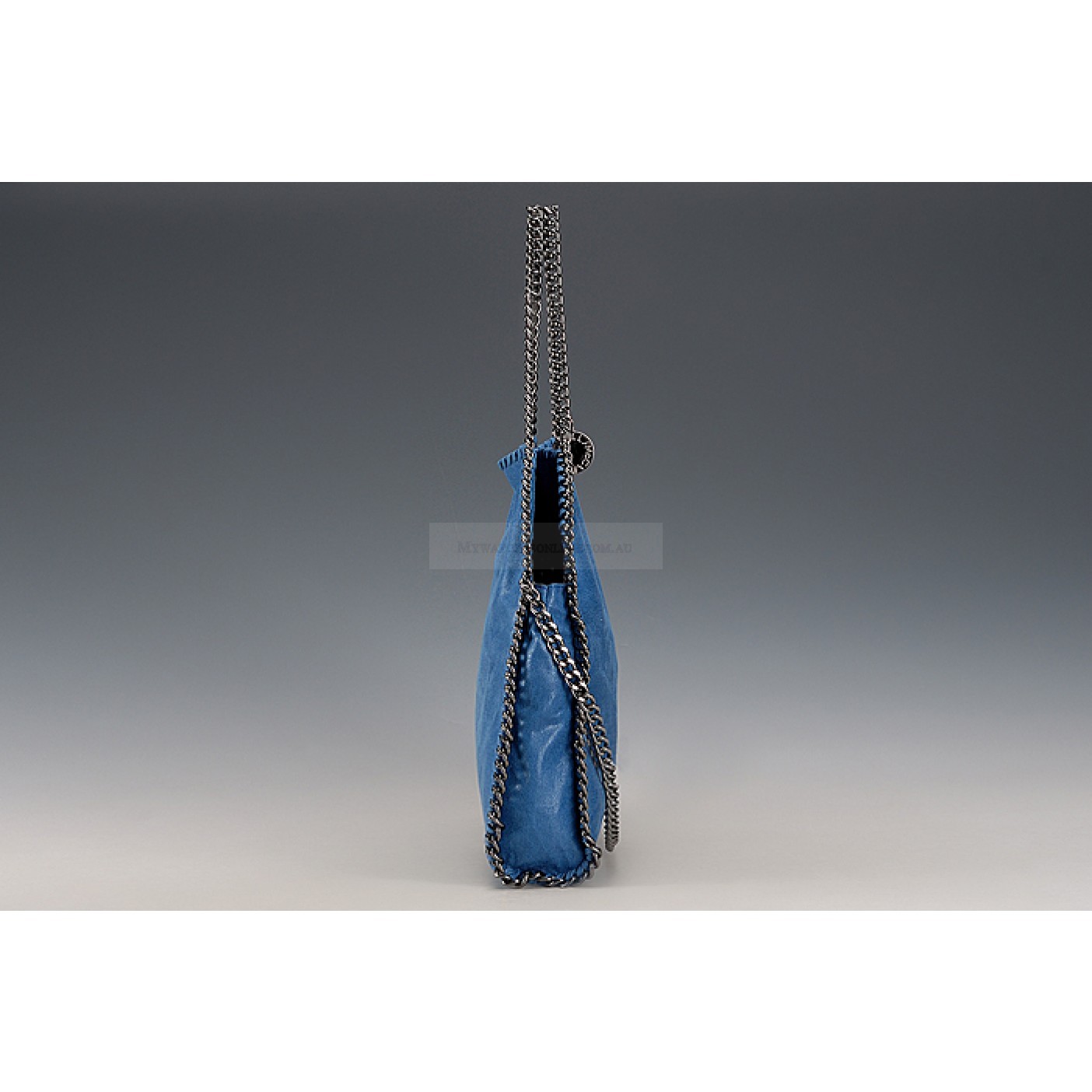 Exterior Blue calfskin leather exterior with slim long base and narrow indented top, a small Stella McCartney engraved polished white metal tab on the link chain strap, two oxidized metal link chain arm-carry straps with the link chain running along the edges al