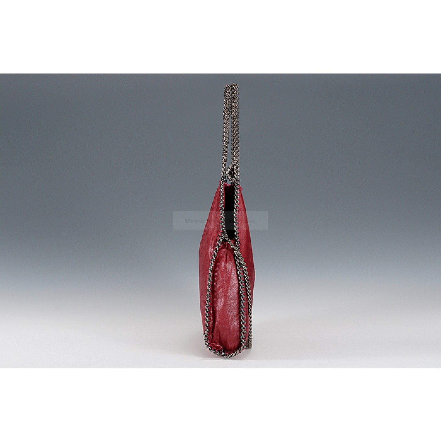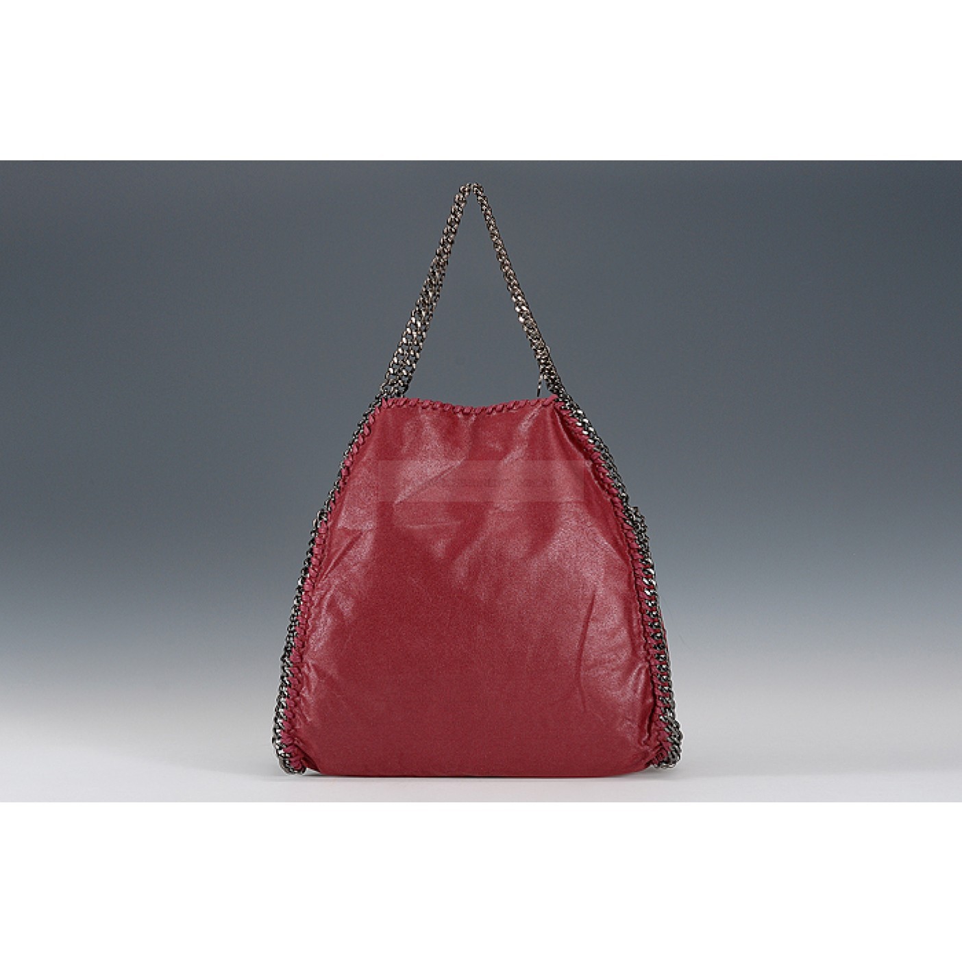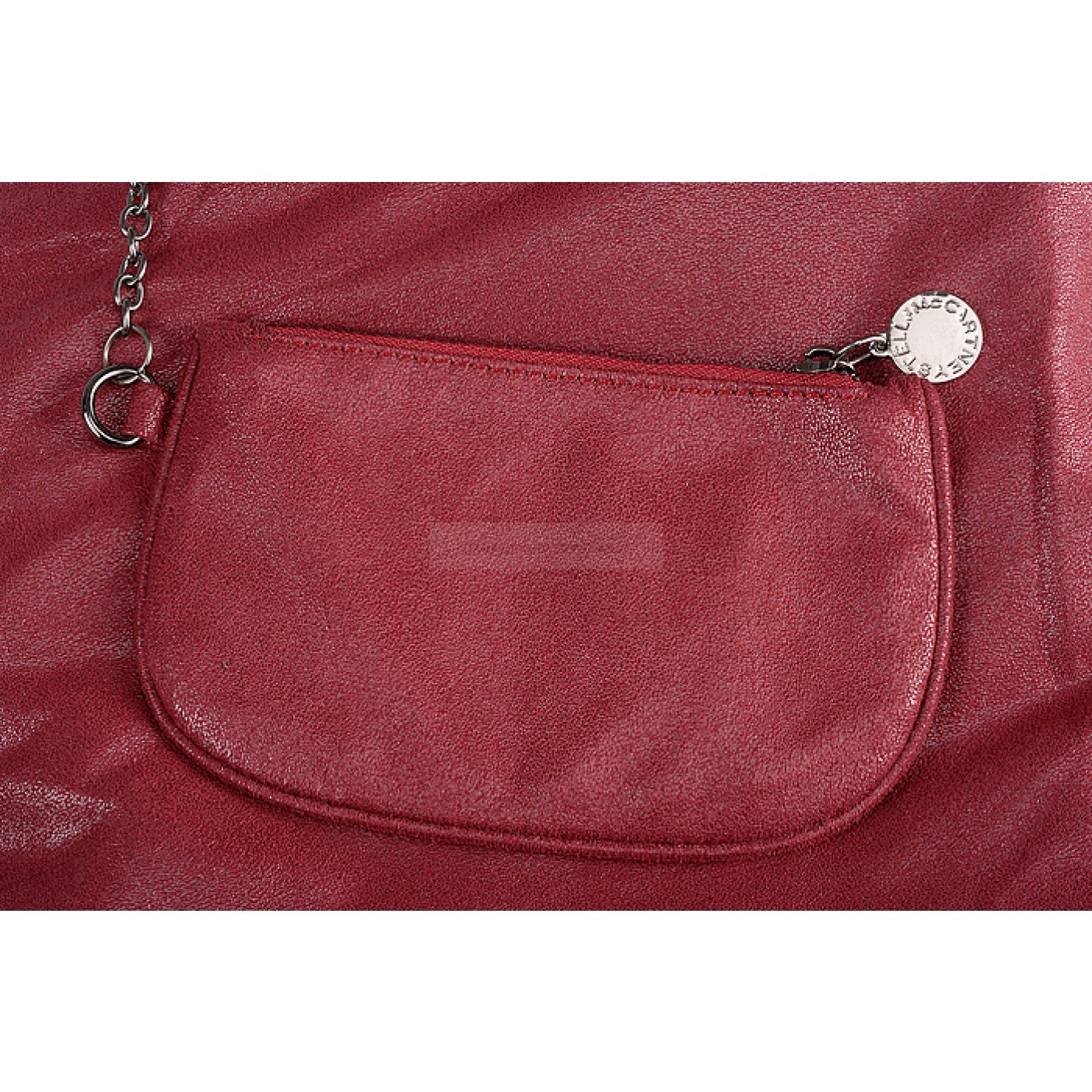 Exterior Dark red calfskin leather exterior with slim long base and narrow indented top, a small Stella McCartney engraved polished white metal tab on the link chain strap, two oxidized metal link chain arm-carry straps with the link chain running along the edges al