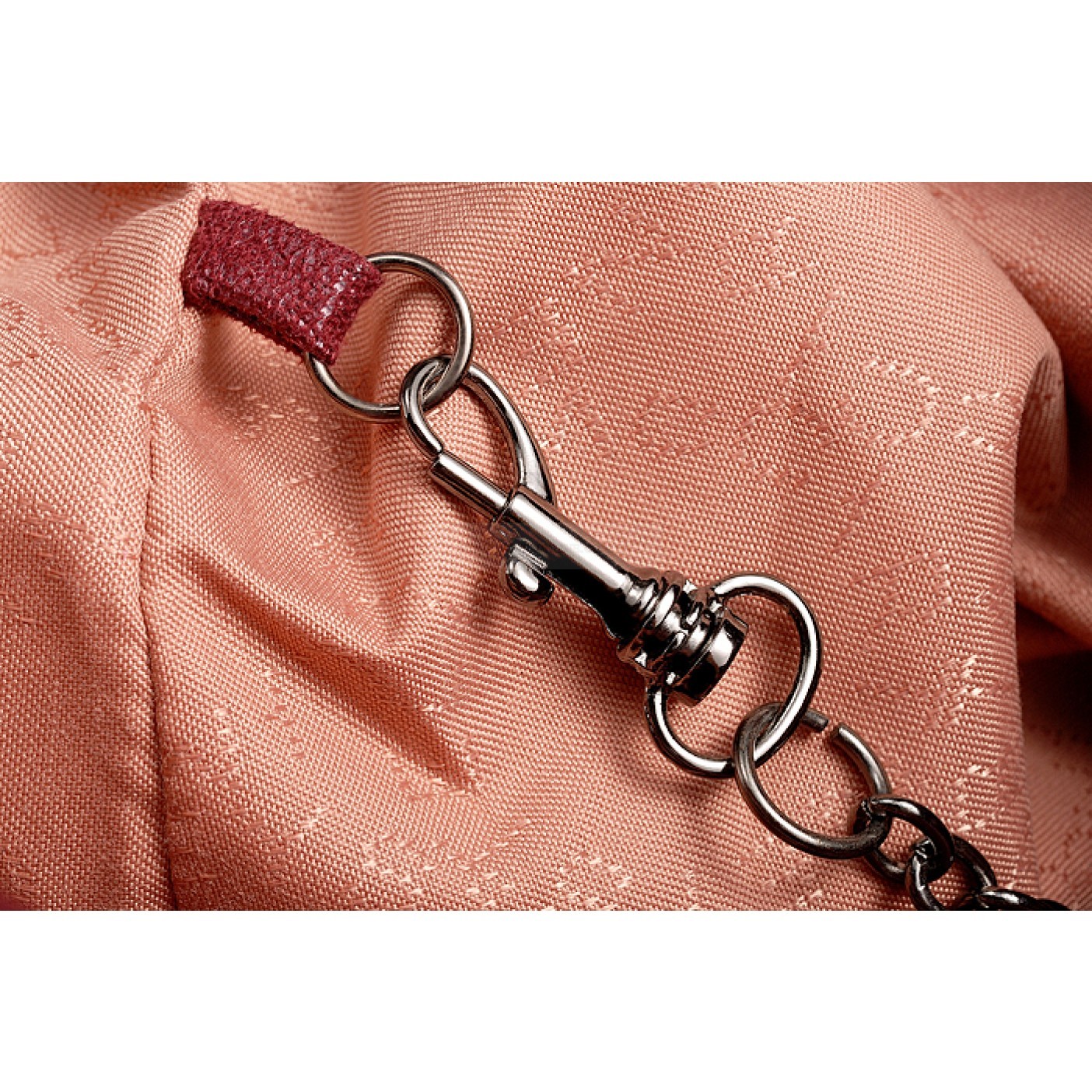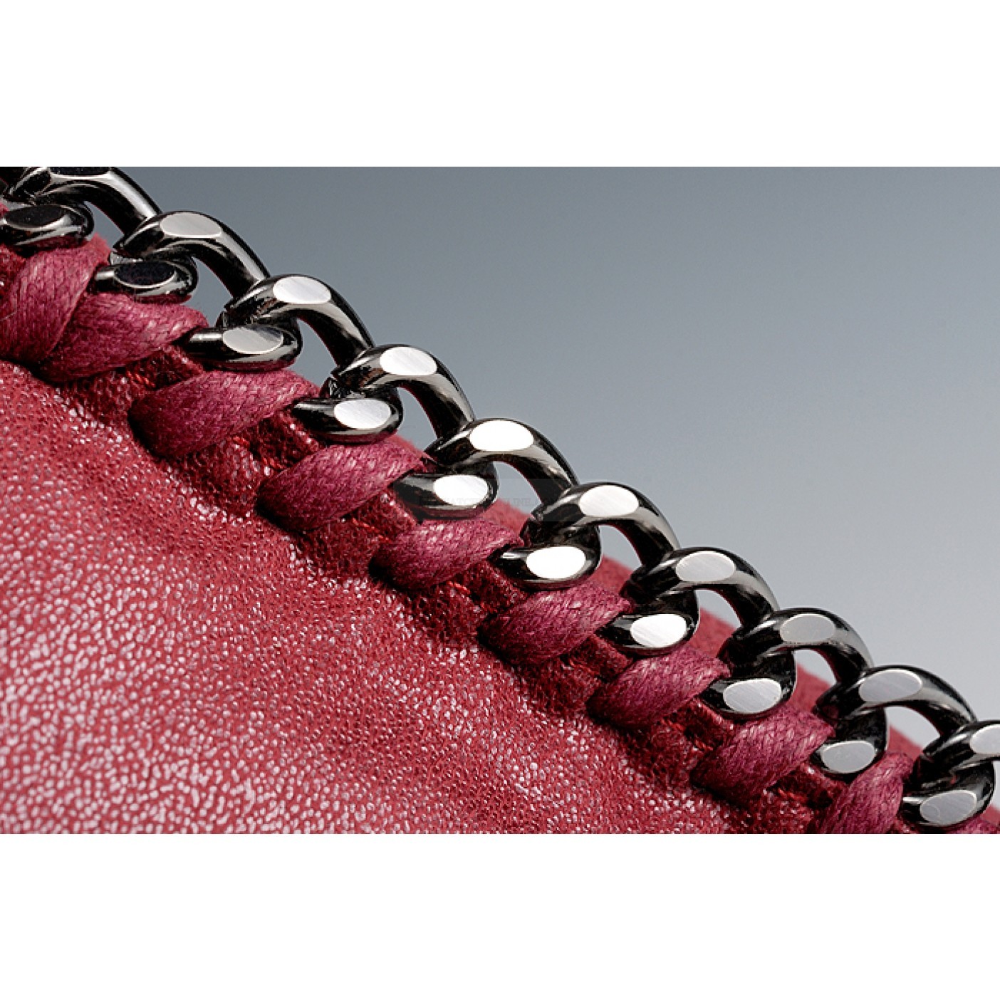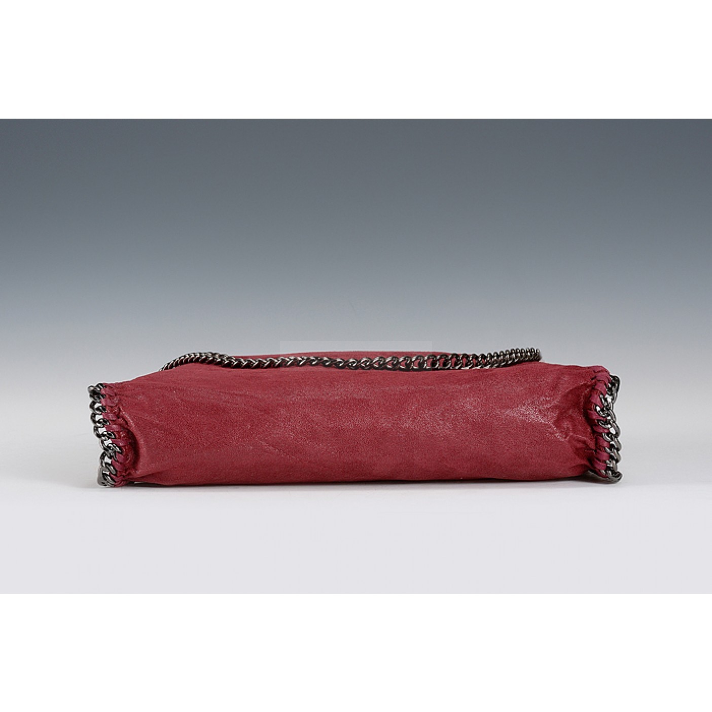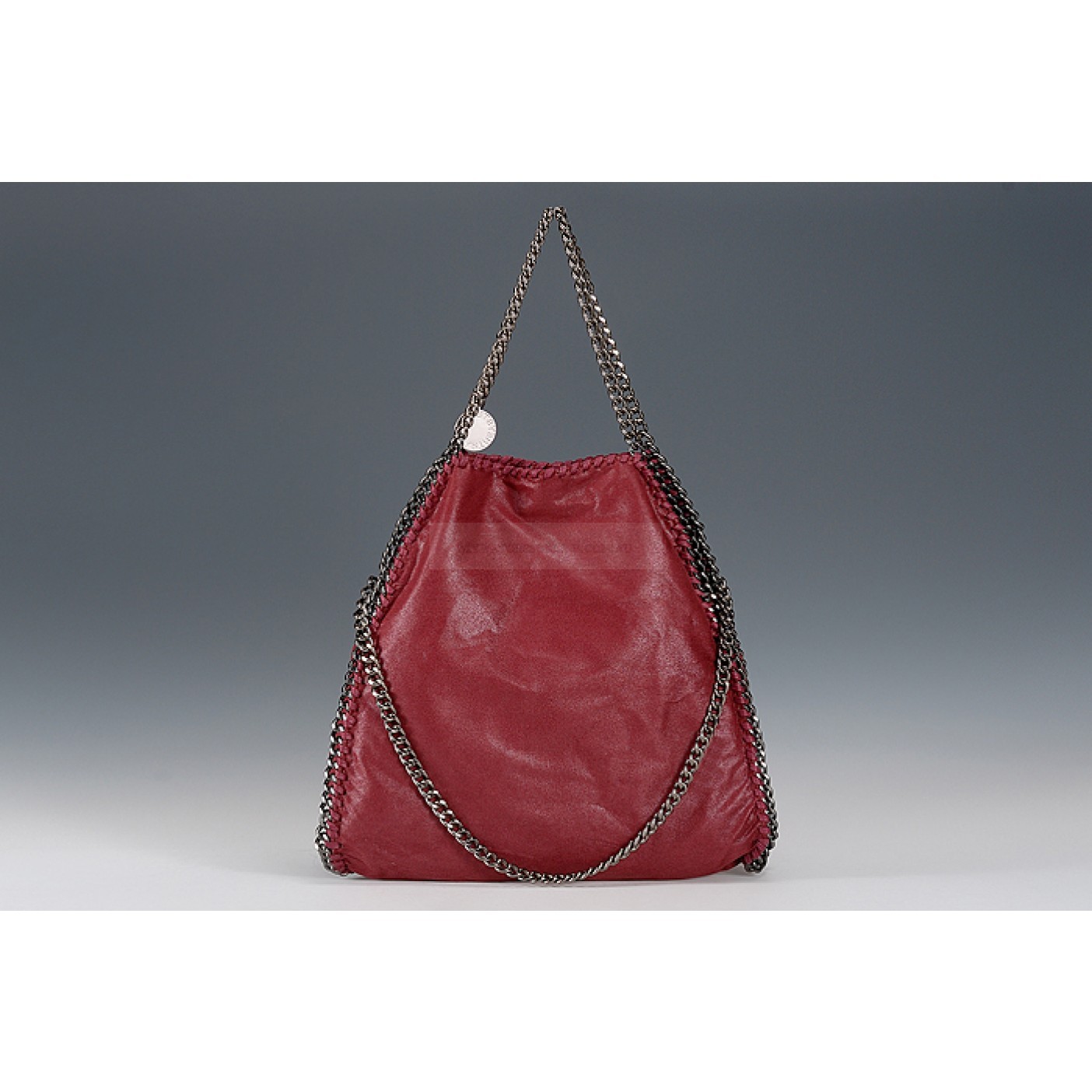 Exterior Dark red calfskin leather exterior with slim long base and narrow indented top, a small Stella McCartney engraved polished white metal tab on the link chain strap, two oxidized metal link chain arm-carry straps with the link chain running along the edges al