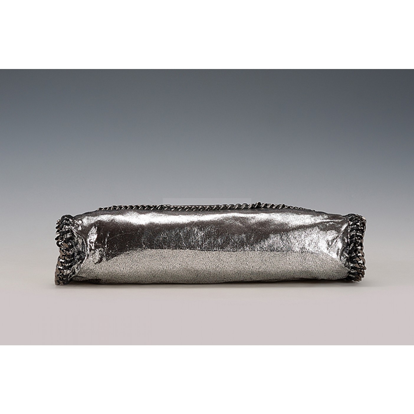 Exterior Silver calfskin leather exterior with slim long base and narrow indented top, a small Stella McCartney engraved polished white metal tab on the link chain strap, two oxidized metal link chain arm-carry straps with the link chain running along the edges all the way on the sides and an oxidized link chain shoulder strap