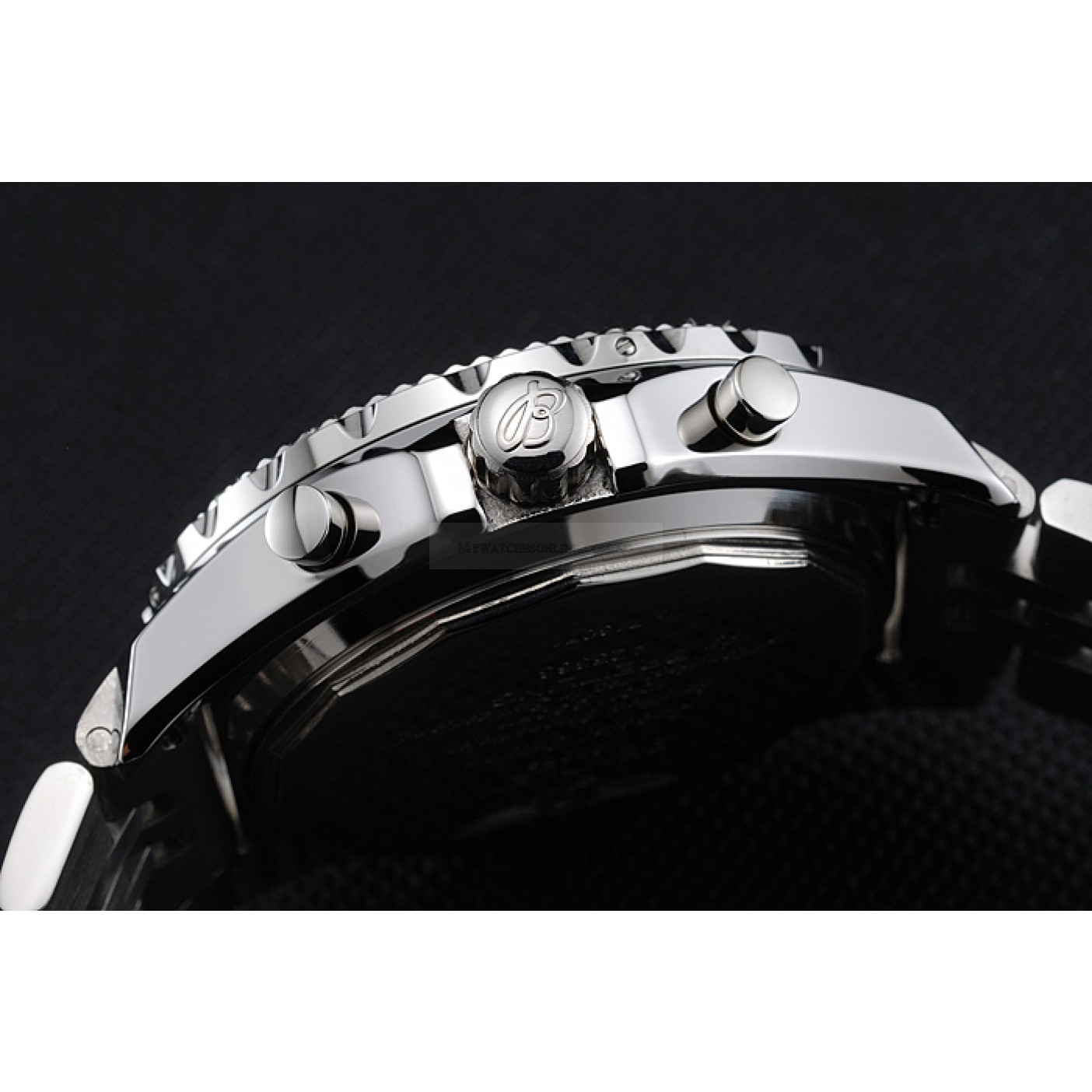 Crown Polished stainless steel cutwork crown with Breitling logo and a round push-button crown on either side of it