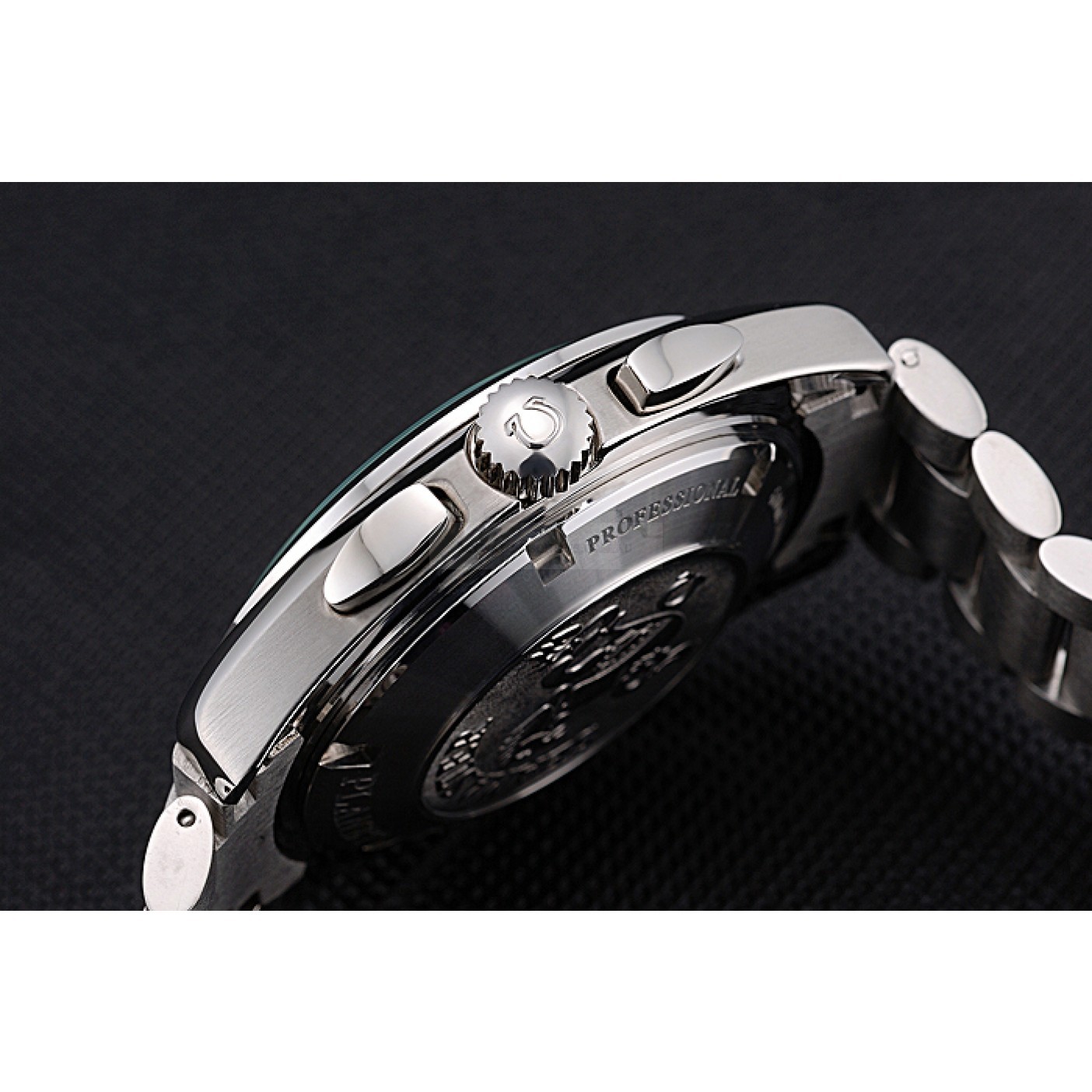 Crown Omega logo engraved polished stainless steel crown with a push-button crown on either side of it