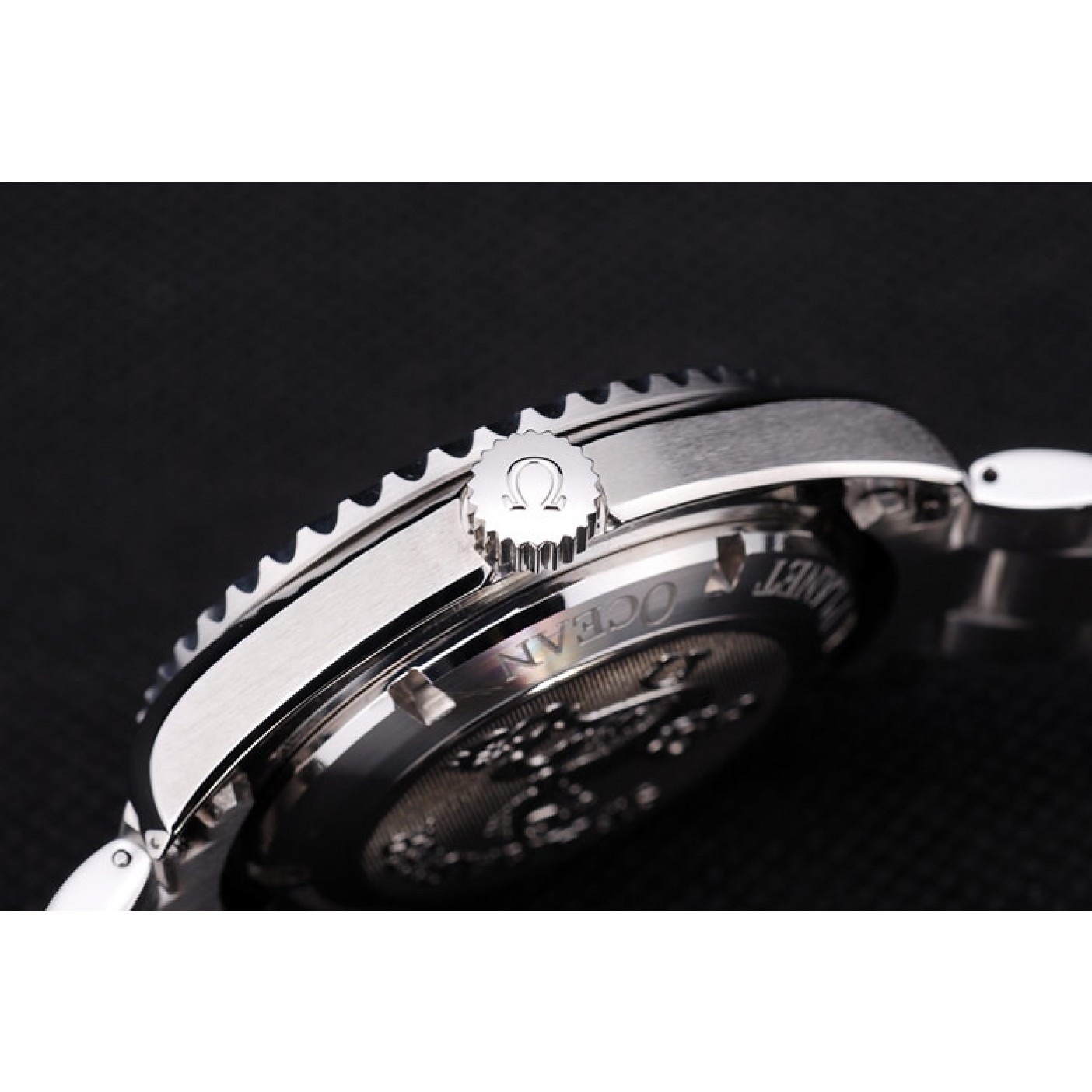 Crown Polished stainless steel cutwork crown with Omega logo plus another similar crown on the opposite top corner