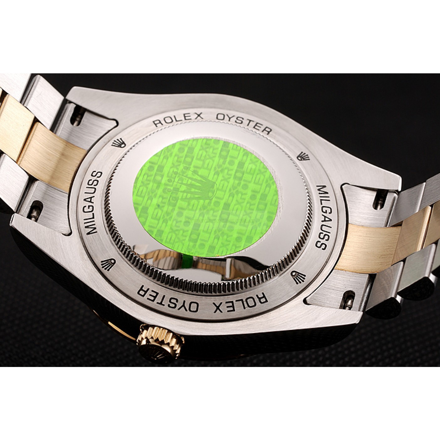 Back Rolex Oyster Milgauss engraved polished stainless steel snap-in back with Rolex green authenticity sticker